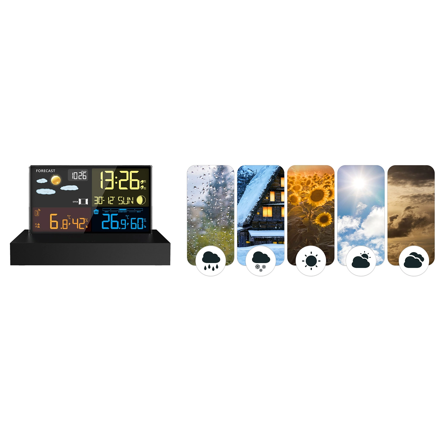 Le grand écran couleur affiche l’heure, la date, la température, l’humidité, des icônes météo et les tendances. La station analyse la pression, la température et l’humidité et fournit une prévision à court terme précise.
