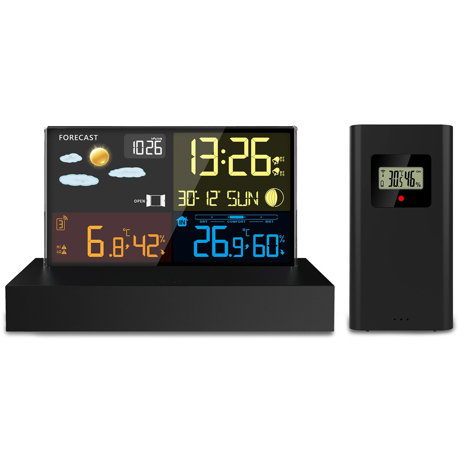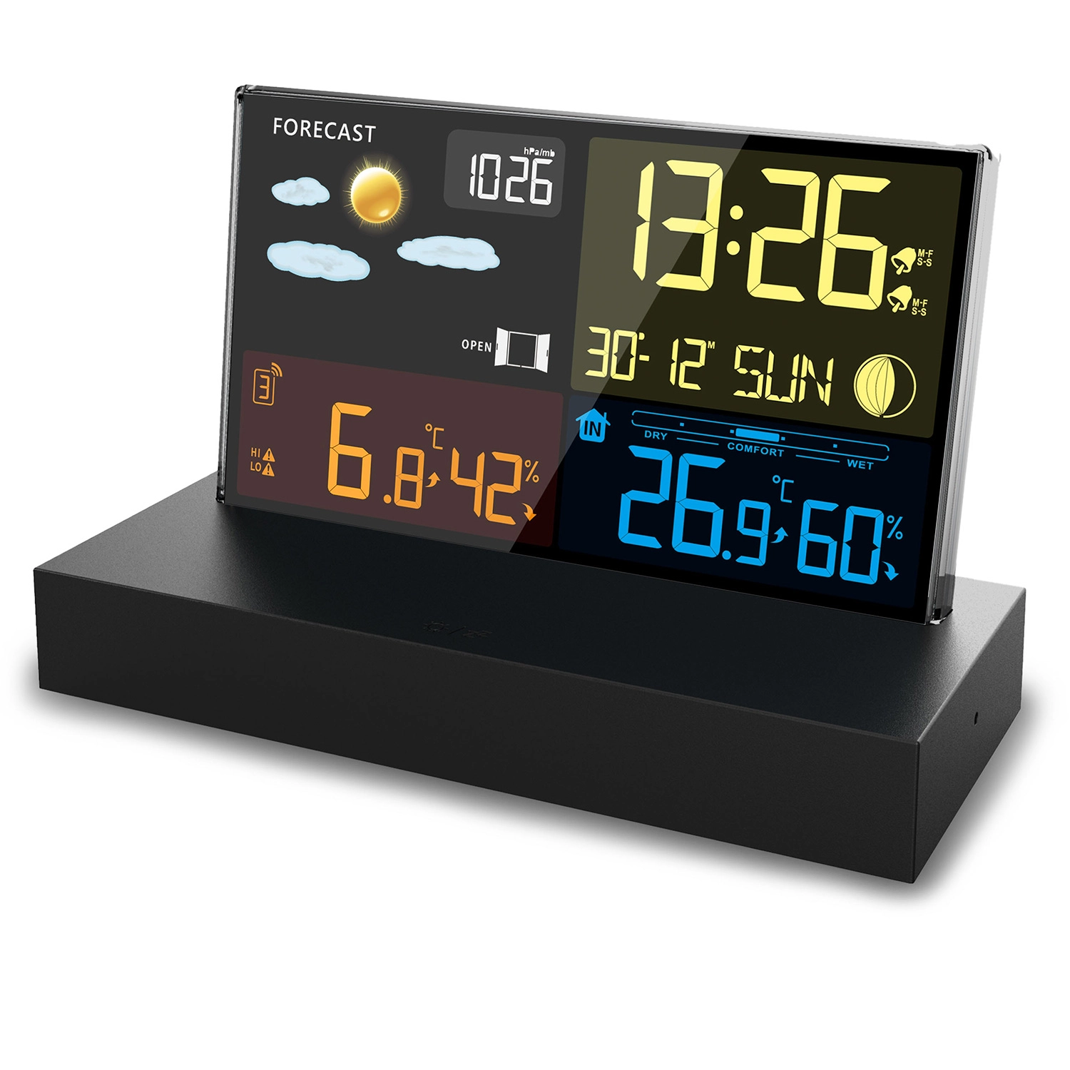 La BD-912 est une station météo de table domestique fiable avec un écran LCD couleur clair, qui affiche l’heure, la date, la température et l’humidité intérieures et extérieures, les tendances, la prévision météo et la pression atmosphérique. L’heure radio-pilotée DCF garantit une précision sans souci et la fonction de réveil avec répétition convient aussi bien à la table de nuit qu’au bureau.