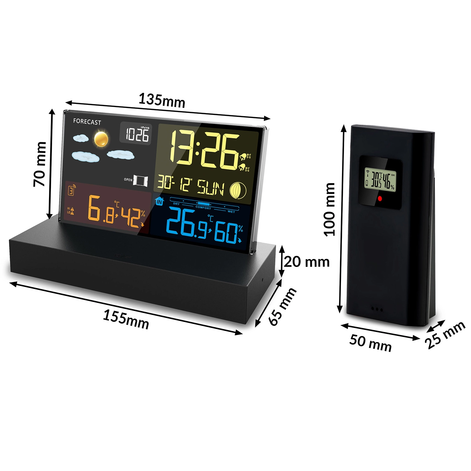 Grâce au capteur sans fil (jusqu’à 60 m, 433,92 MHz), vous obtenez des valeurs extérieures actuelles. L’appareil enregistre les valeurs min./max., avertit en cas de gel et de chaleur et affiche un indicateur de confort pour un climat intérieur sain. Il prend en charge jusqu’à 3 canaux pour plusieurs zones dans la maison.