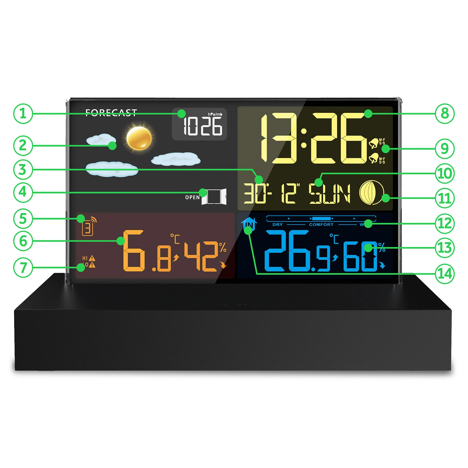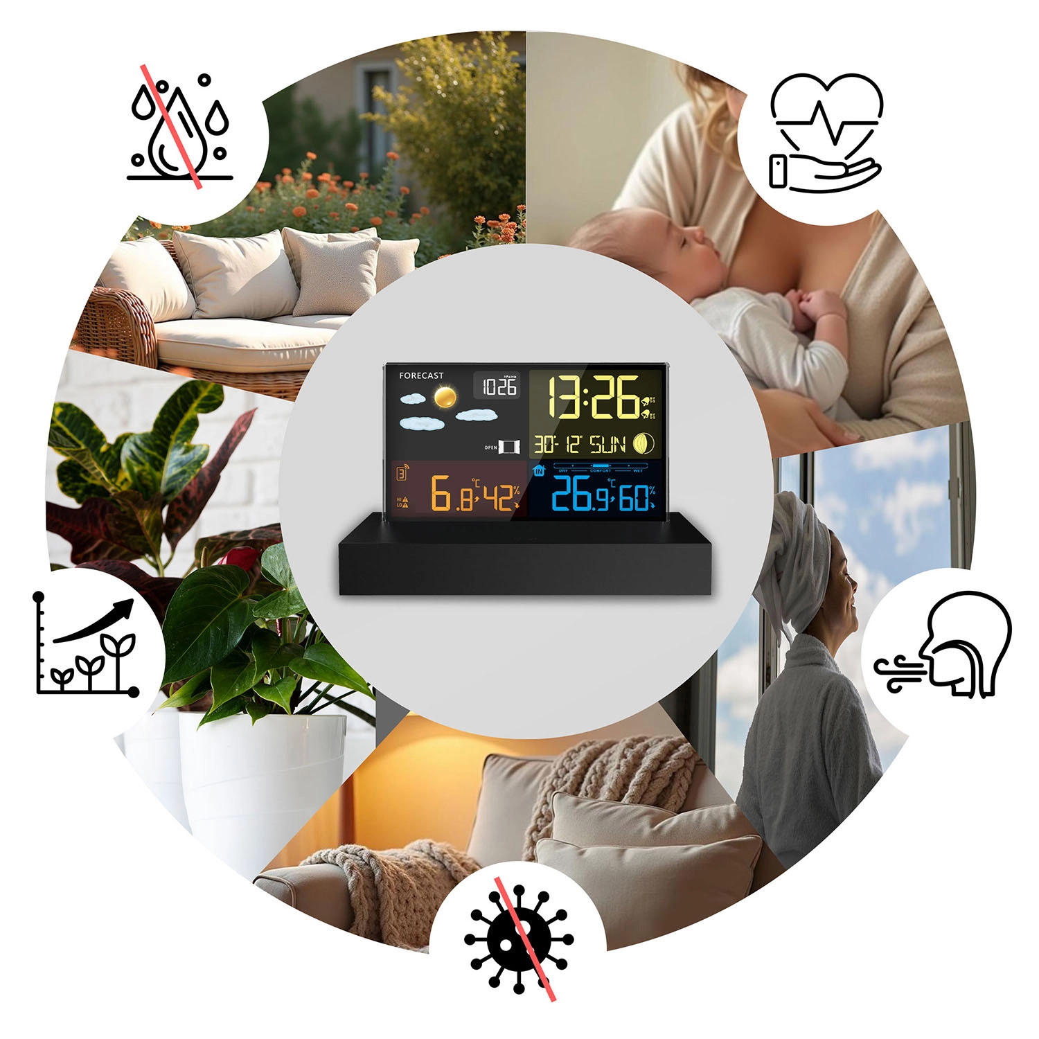 L’heure radio-pilotée DCF, le réveil avec fonction répétition et l’indicateur de confort aident à gérer le rythme quotidien et un climat intérieur sain.