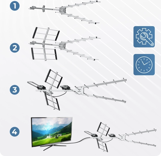 L’installation se fait en quelques minutes : dépliez l’antenne, enclenchez les réflecteurs, connectez le câble coaxial et regardez la TV. Sans outils et sans stress. Avec l’antenne Berdsen, vous obtenez plus de chaînes sans abonnement et une image nette en 4K Ultra HD.