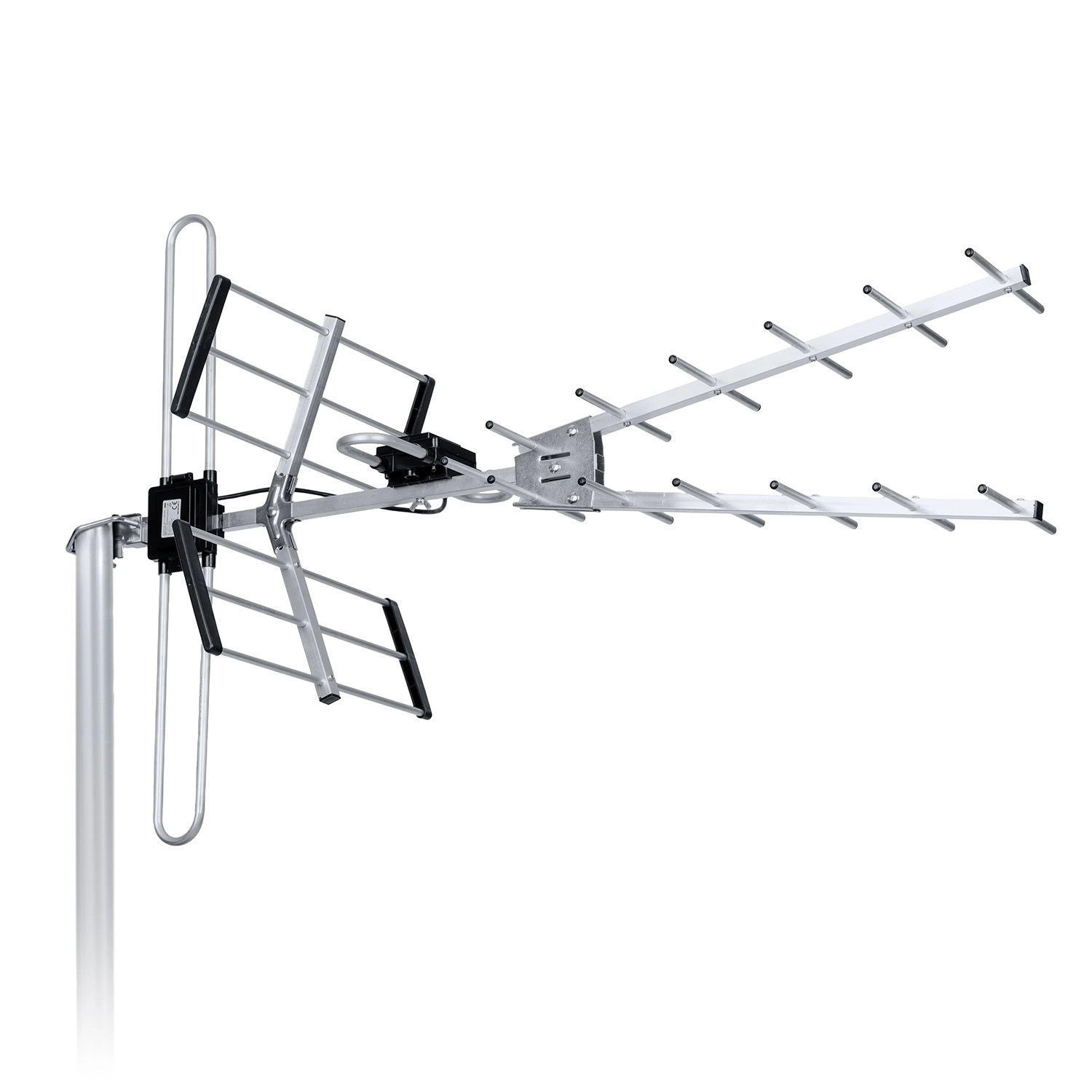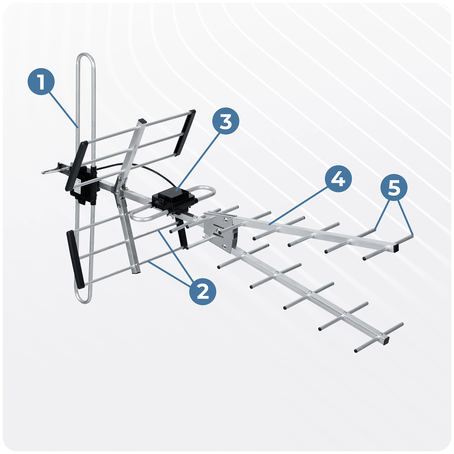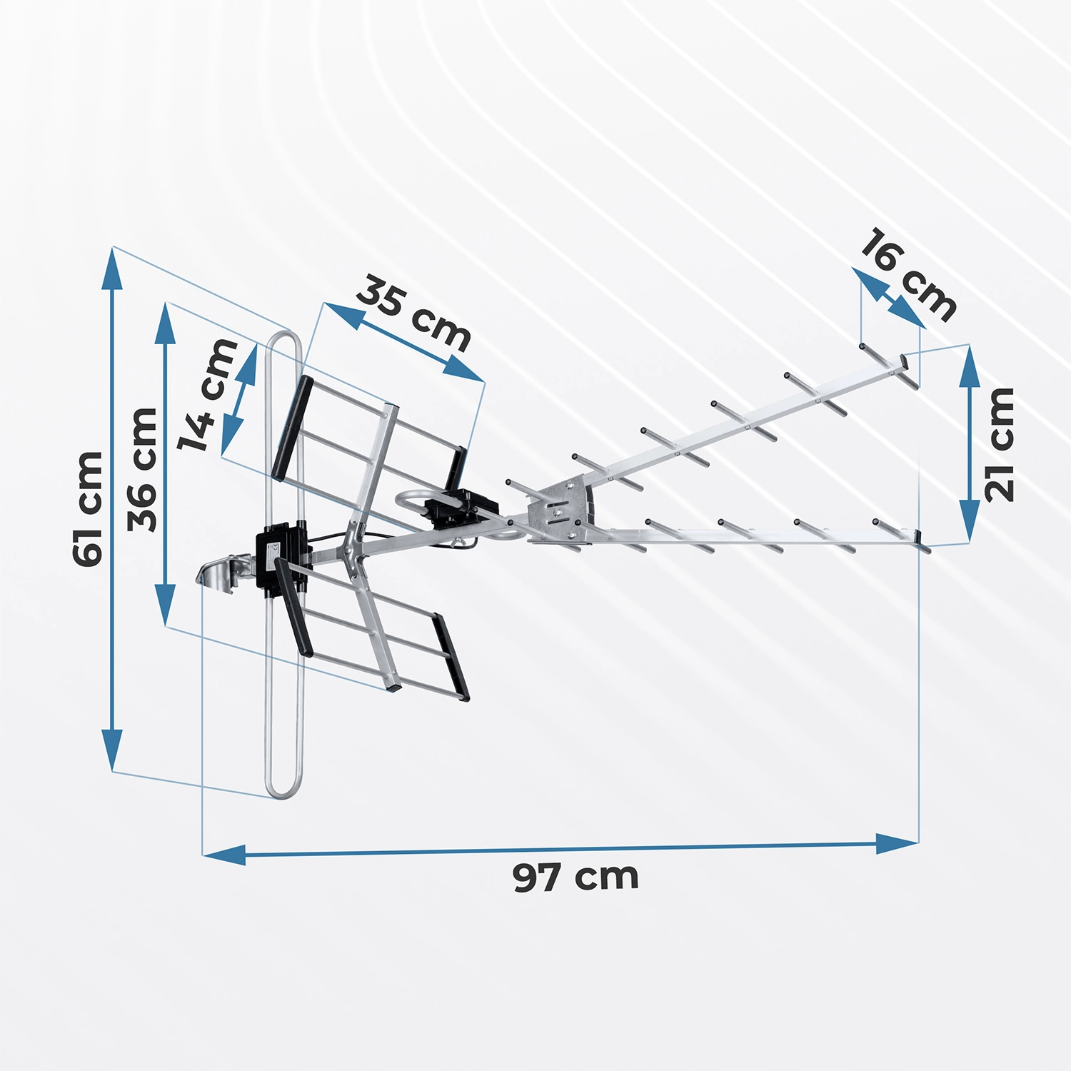L’antenne Berdsen est conçue pour une réception sûre même dans des conditions plus exigeantes. Grâce à sa conception Yagi directionnelle avec réflecteurs et directeurs, elle atteint un gain jusqu’à 16 dB et une haute sélectivité FBR ≥ 24 dB, ce qui réduit les interférences arrière et améliore la pureté du signal. Le filtre LTE intégré élimine l’influence des réseaux mobiles 4G/5G pour obtenir une image nette et un son fluide.