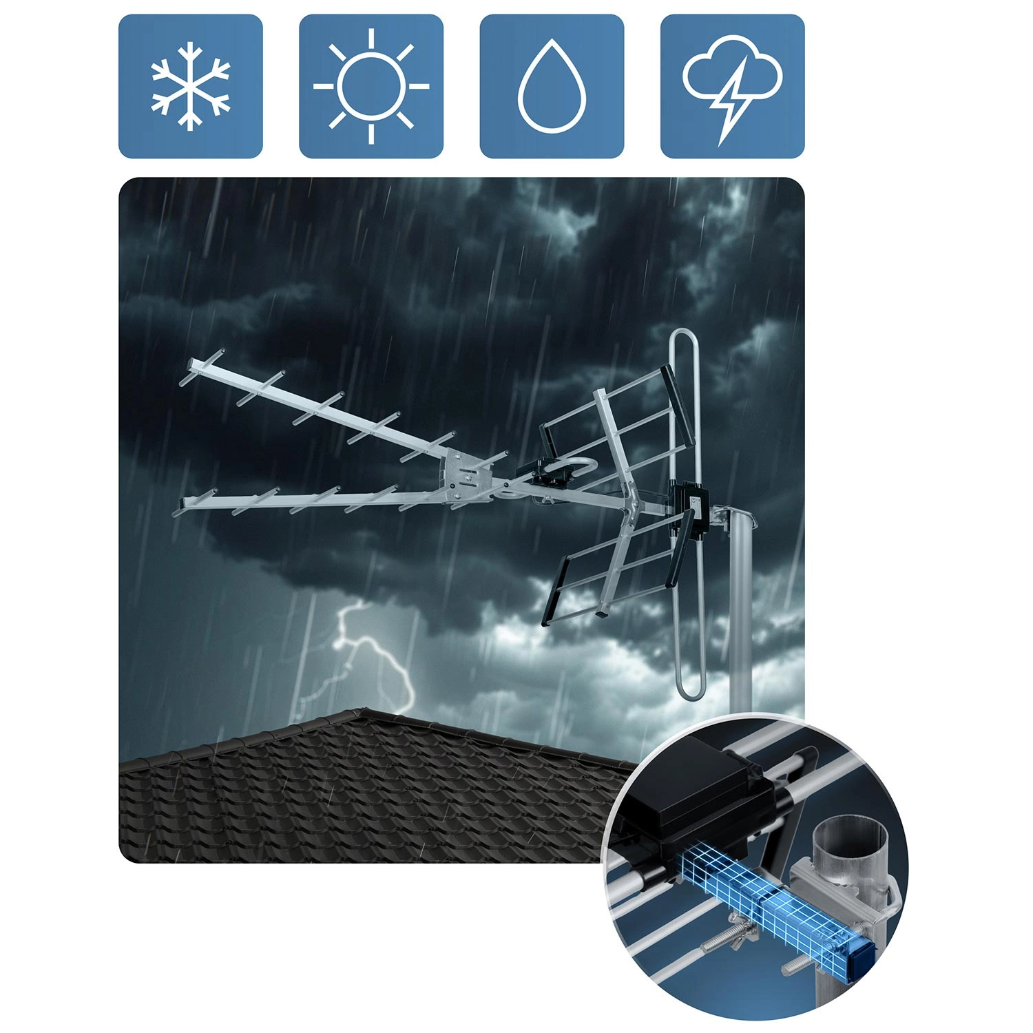 Des matériaux solides et une fixation robuste assurent une réception fiable toute l’année – du soleil à la pluie, jusqu’à la neige et au vent.