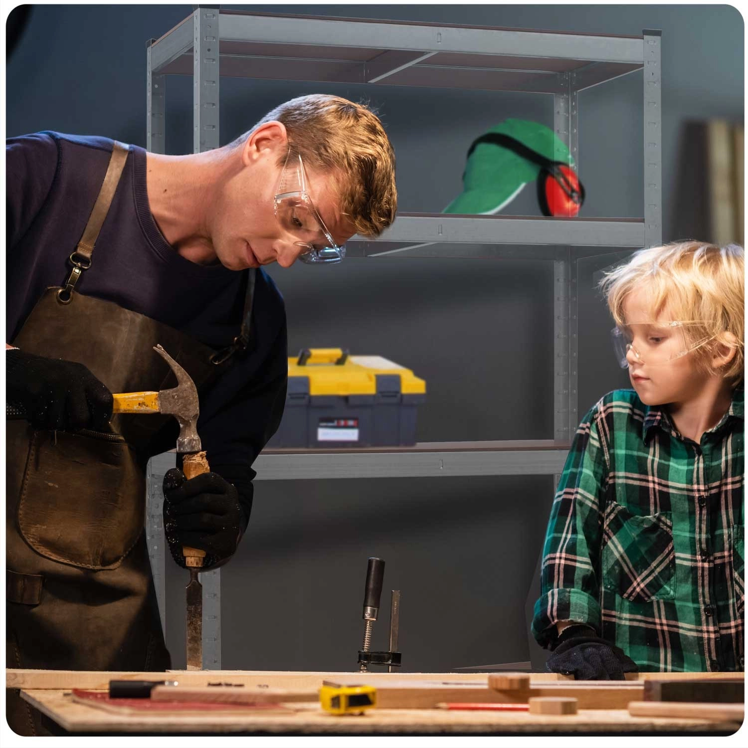 La structure à emboîtement sans vis assure un montage rapide et une grande rigidité sans vacillement. Les bords arrondis améliorent la sécurité de manipulation, les embouts plastiques protègent le sol et renforcent la stabilité. L’étagère peut être divisée en deux unités plus basses ou configurée en plan de travail pour l’atelier.