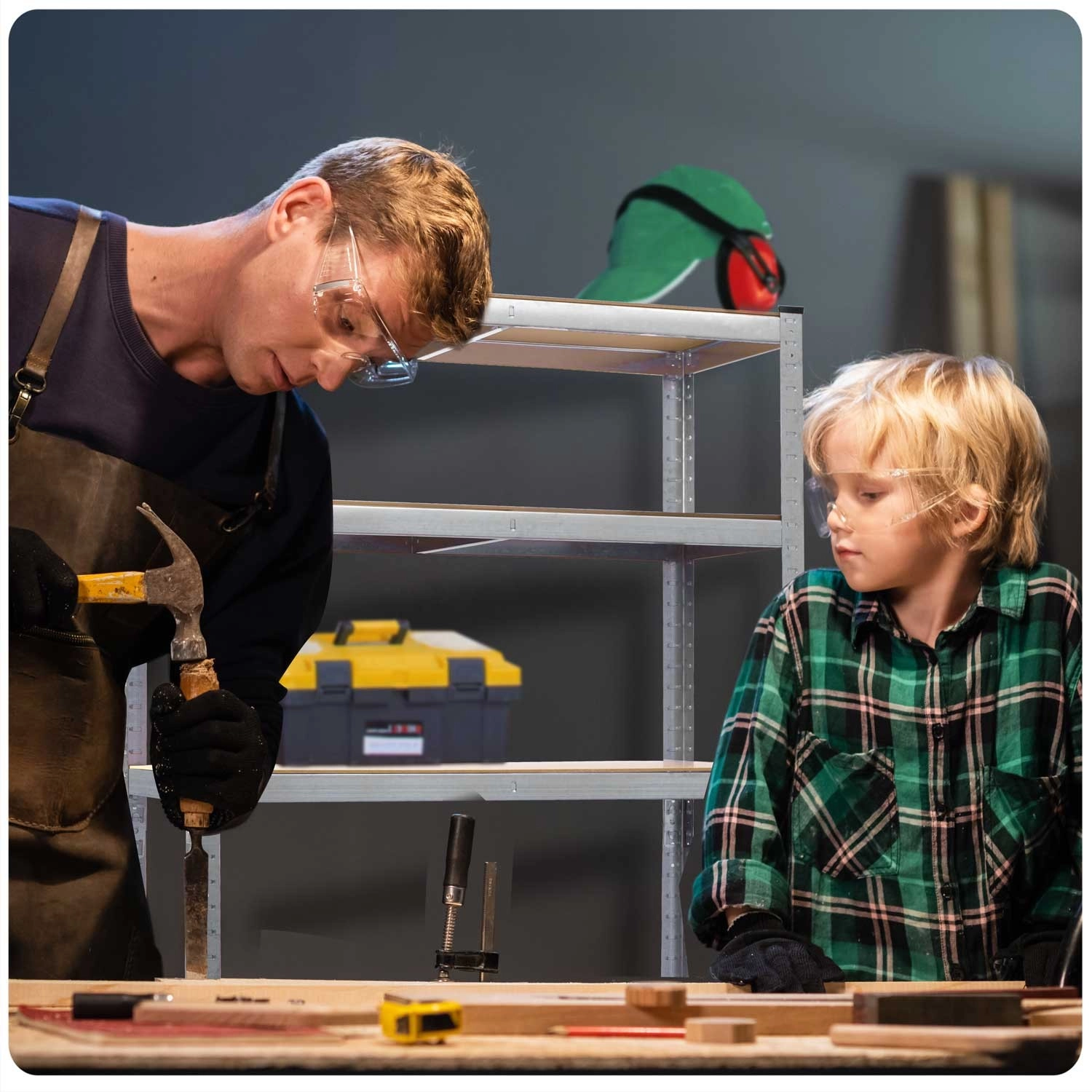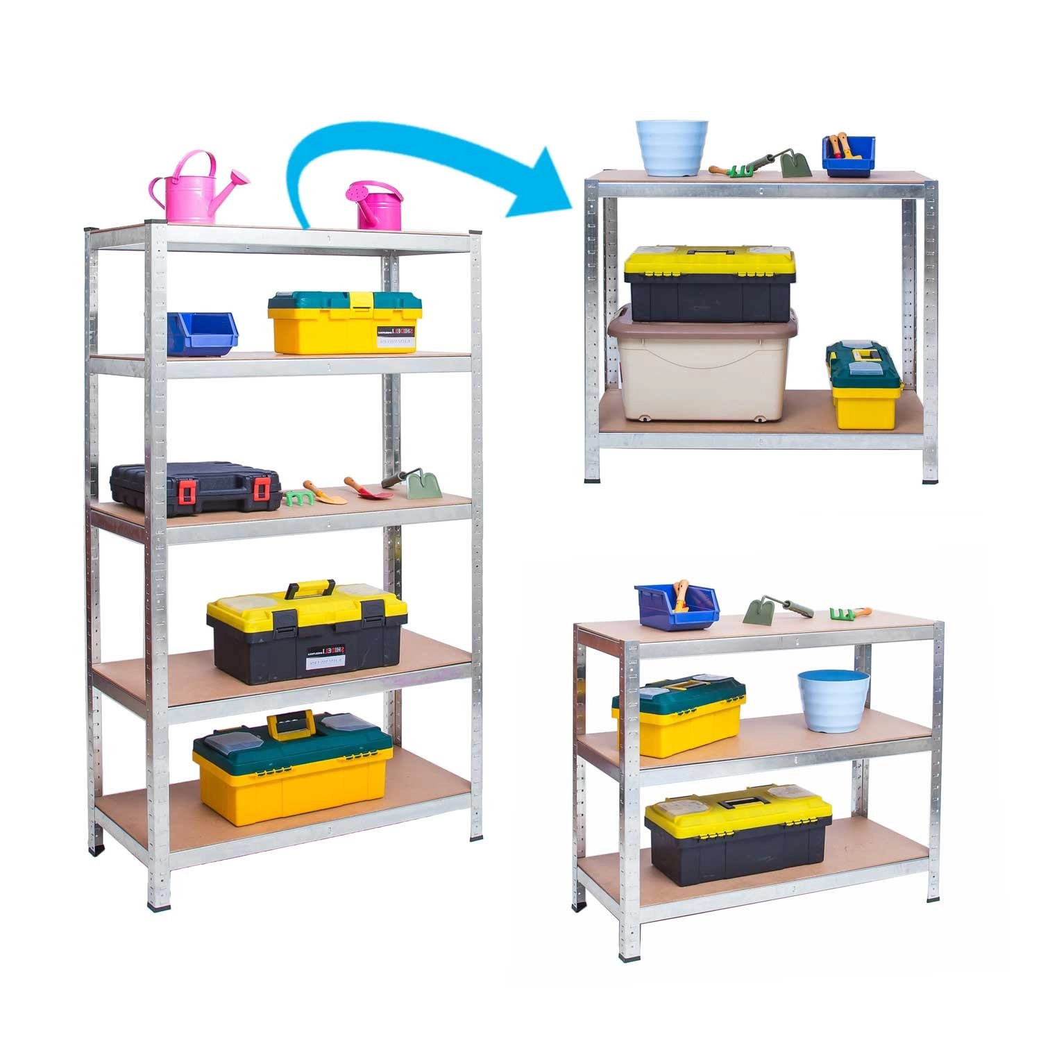 La hauteur des étagères est réglable par pas de 40 mm et l’ensemble peut être divisé en deux unités plus petites. Vous exploitez ainsi facilement l’espace dans le garage, l’atelier ou la cave.