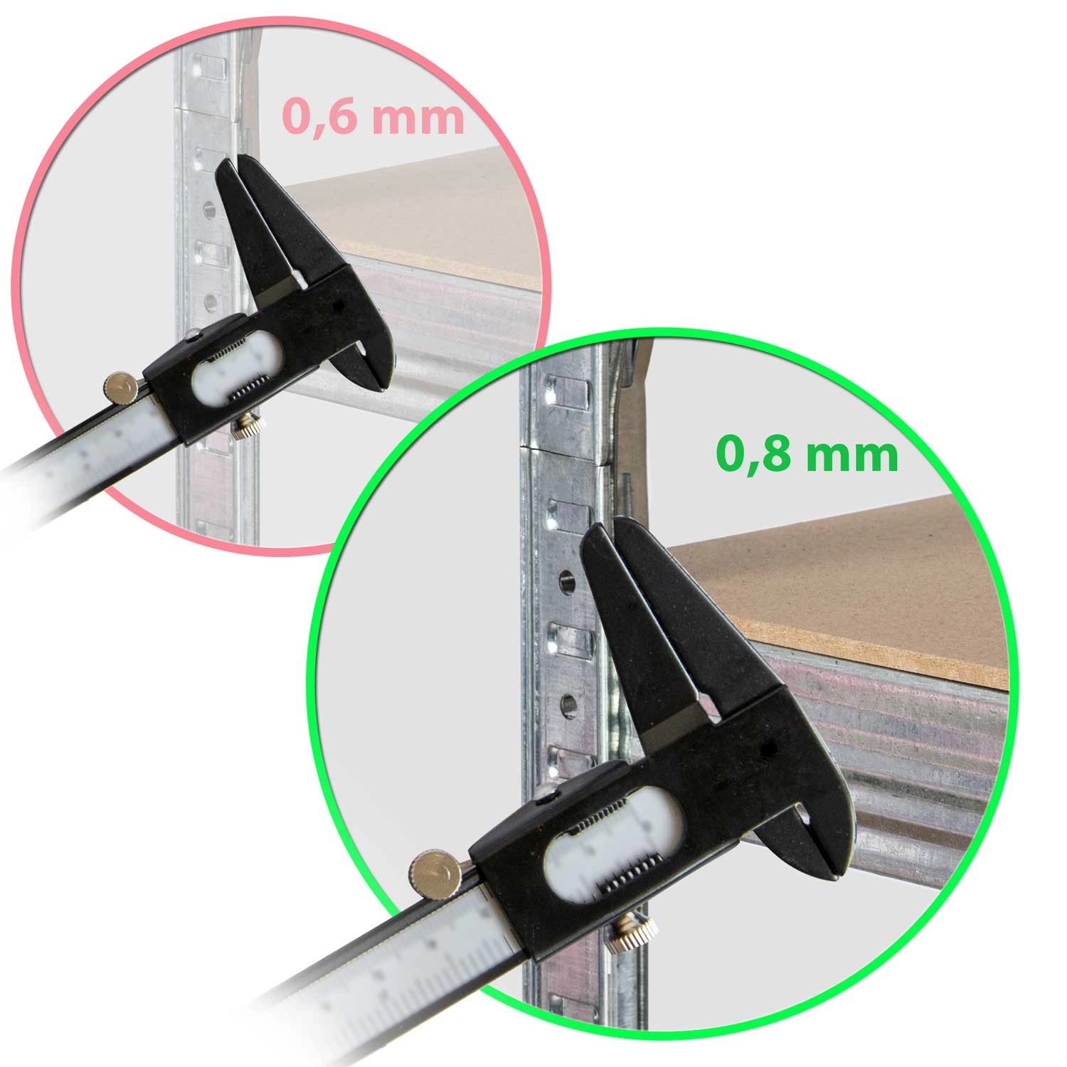 Des profils en acier galvanisé de 0,8 mm d’épaisseur et des renforts centraux des étagères garantissent une grande stabilité et une longue durée de vie même en cas de charge maximale.