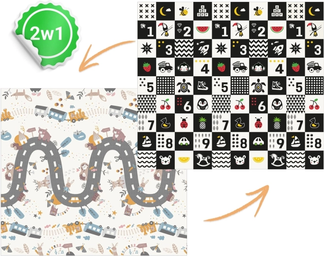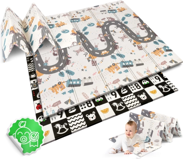 Un côté propose des motifs éducatifs à fort contraste avec des chiffres pour stimuler la vision et l’éveil précoce, l’autre côté présente une scène routière et animale pour un jeu créatif et l’imagination.