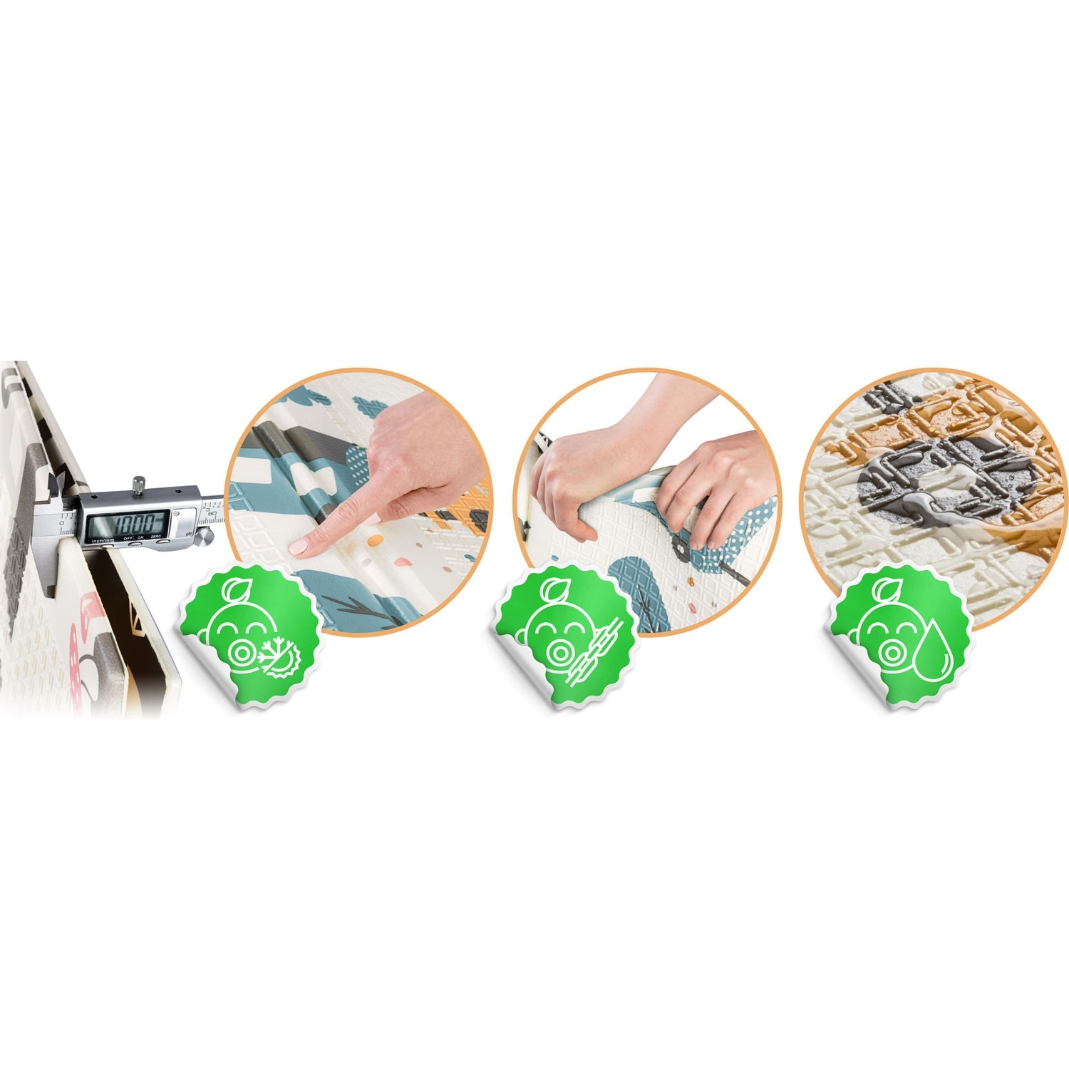 L’épaisseur de 1 cm en mousse XPE absorbe les chocs, isole du froid et, grâce à sa texture antidérapante, favorise un rampement sécurisé et les premiers pas sur sols durs.
