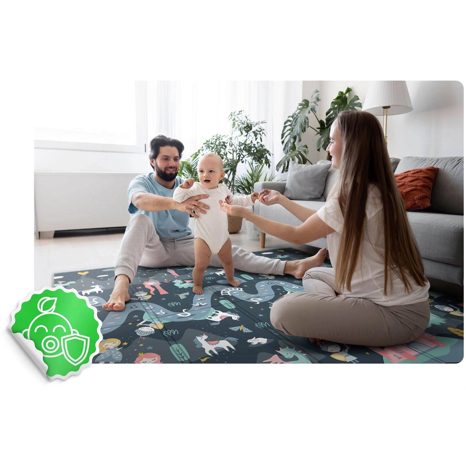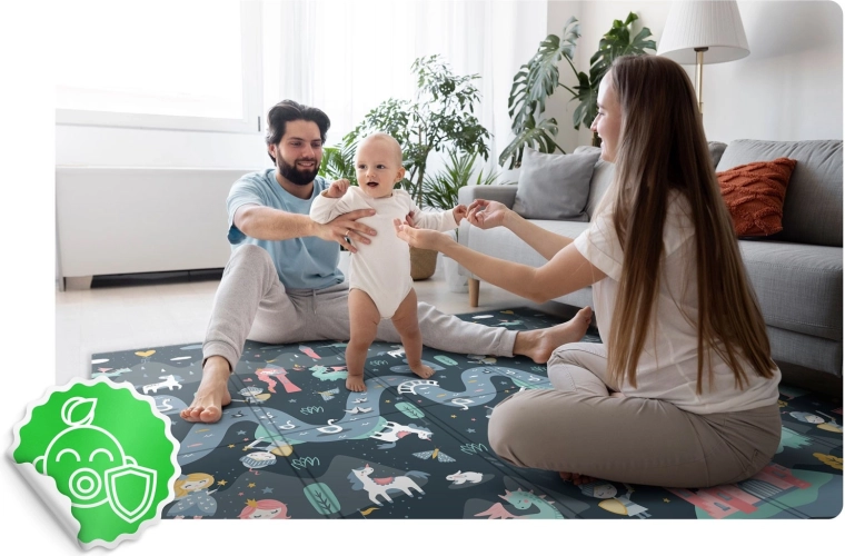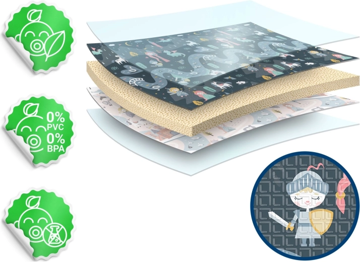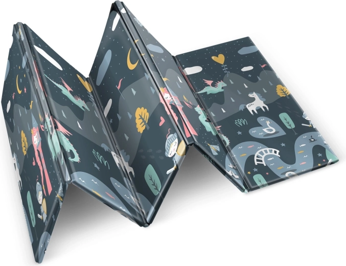 Le tapis est imperméable et facile à nettoyer – il suffit d’essuyer avec un chiffon humide. Sa structure antidérapante assure la stabilité sur différents sols et son pliage solide à répétition facilite le transport et le rangement à la maison, dans la voiture ou sous le lit. Le matériau ne contient ni BPA, ni PVC, ni phtalates, ni formamide et répond aux normes de sécurité européennes EN71, avec certification CE.