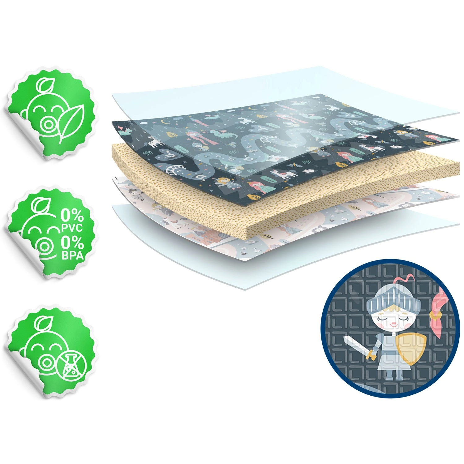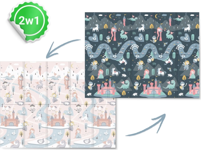 Chaque face propose un motif différent – une variante plus sombre et une plus claire avec châteaux, dragons et licornes. Changez facilement l’ambiance de la pièce et stimulez l’imagination des enfants pendant le jeu et l’apprentissage.