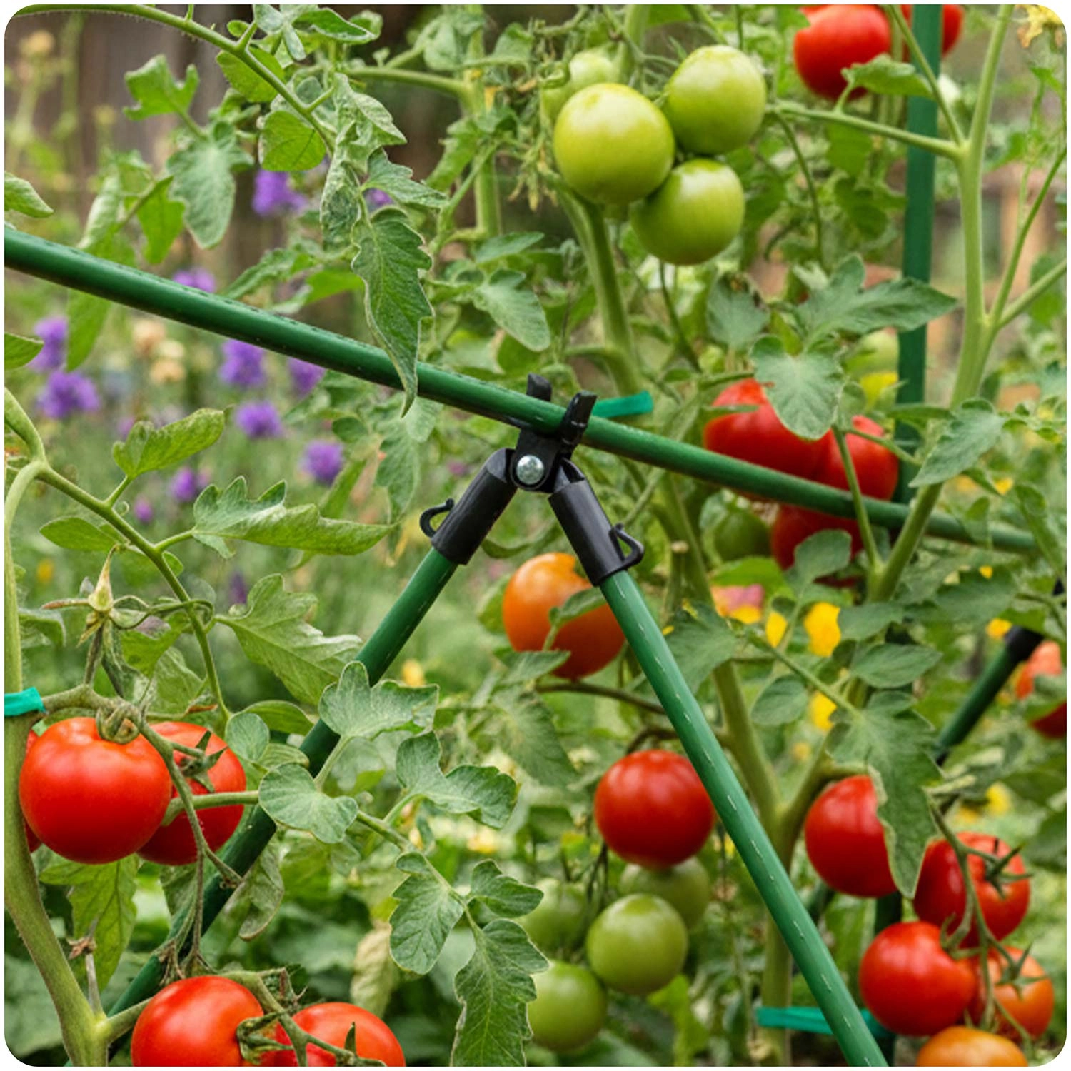 Un cadre en tiges de 11 mm reliées par ces colliers offre une sécurité même pour les rameaux chargés de tomates et facilite le tuteurage et la mise en forme des plantes.
