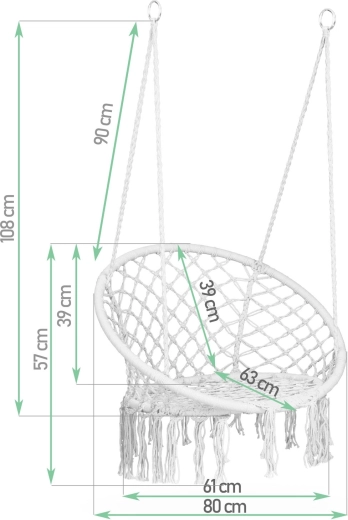 La stabilité est assurée par des cerceaux métalliques et des cordes de montage à double tressage avec œillets métalliques. L’installation est possible sur un seul point d’ancrage (pour un balancement plus prononcé) ou sur deux points séparés (pour une plus grande stabilité). Une fois démonté, le fauteuil prend très peu de place et se range facilement.