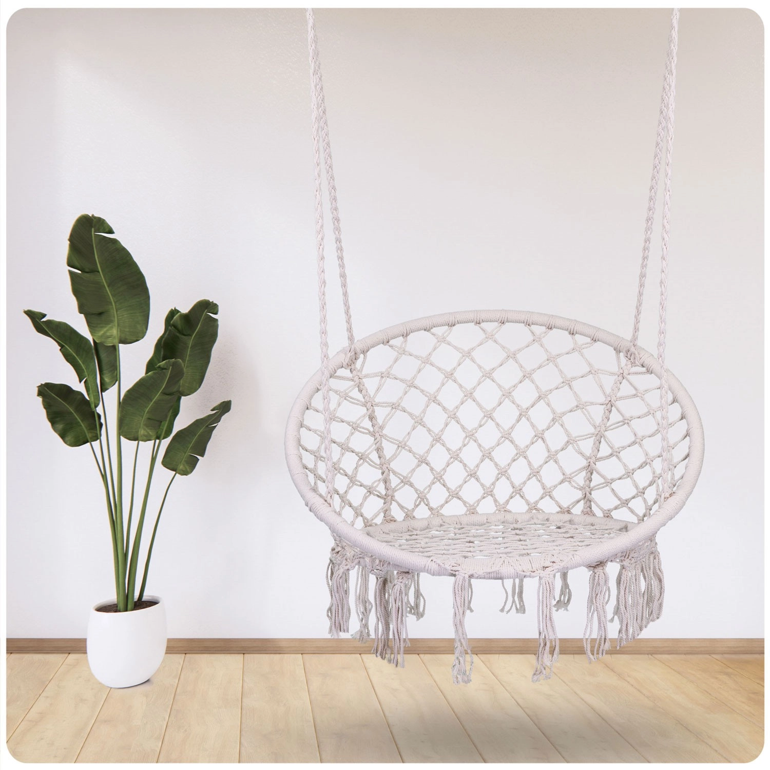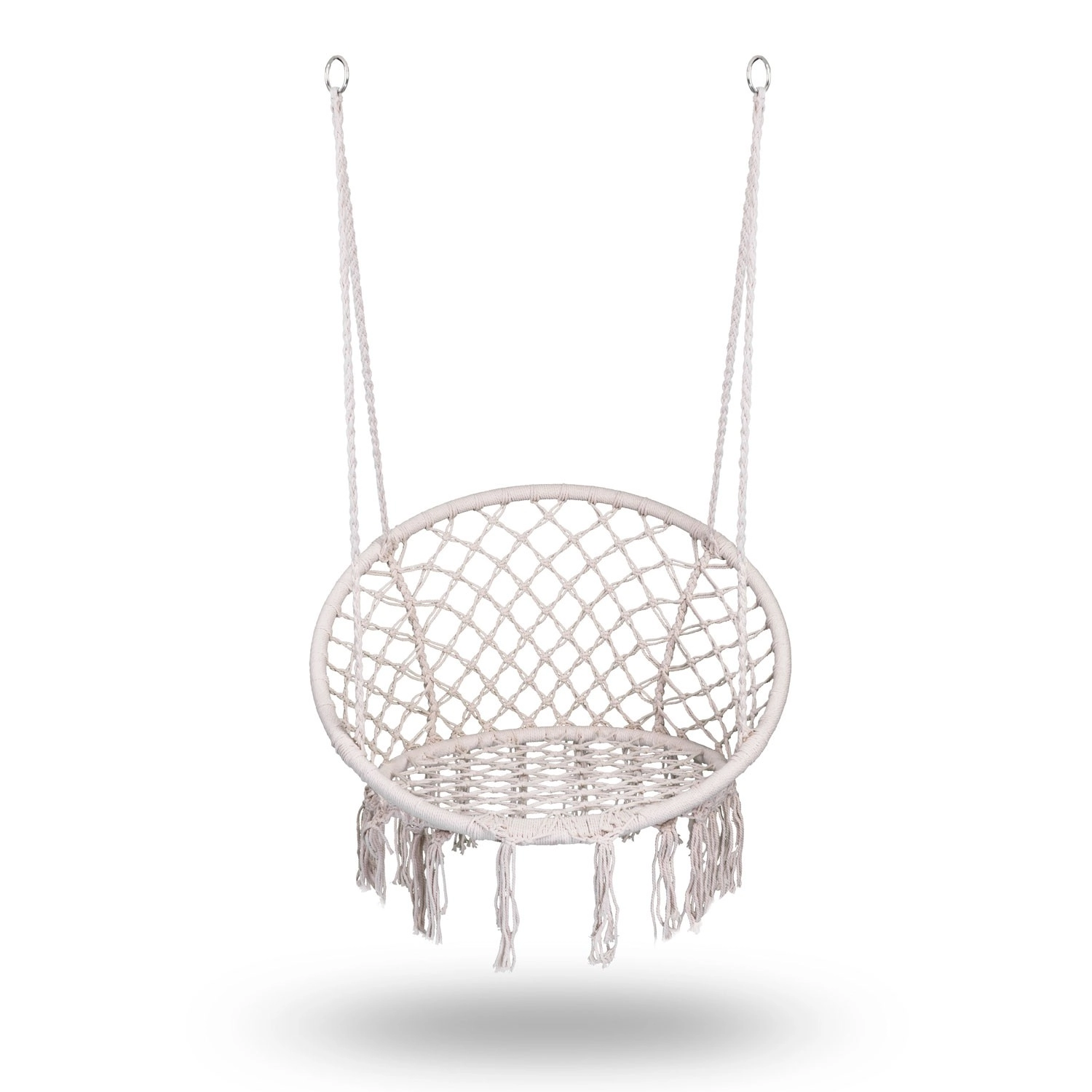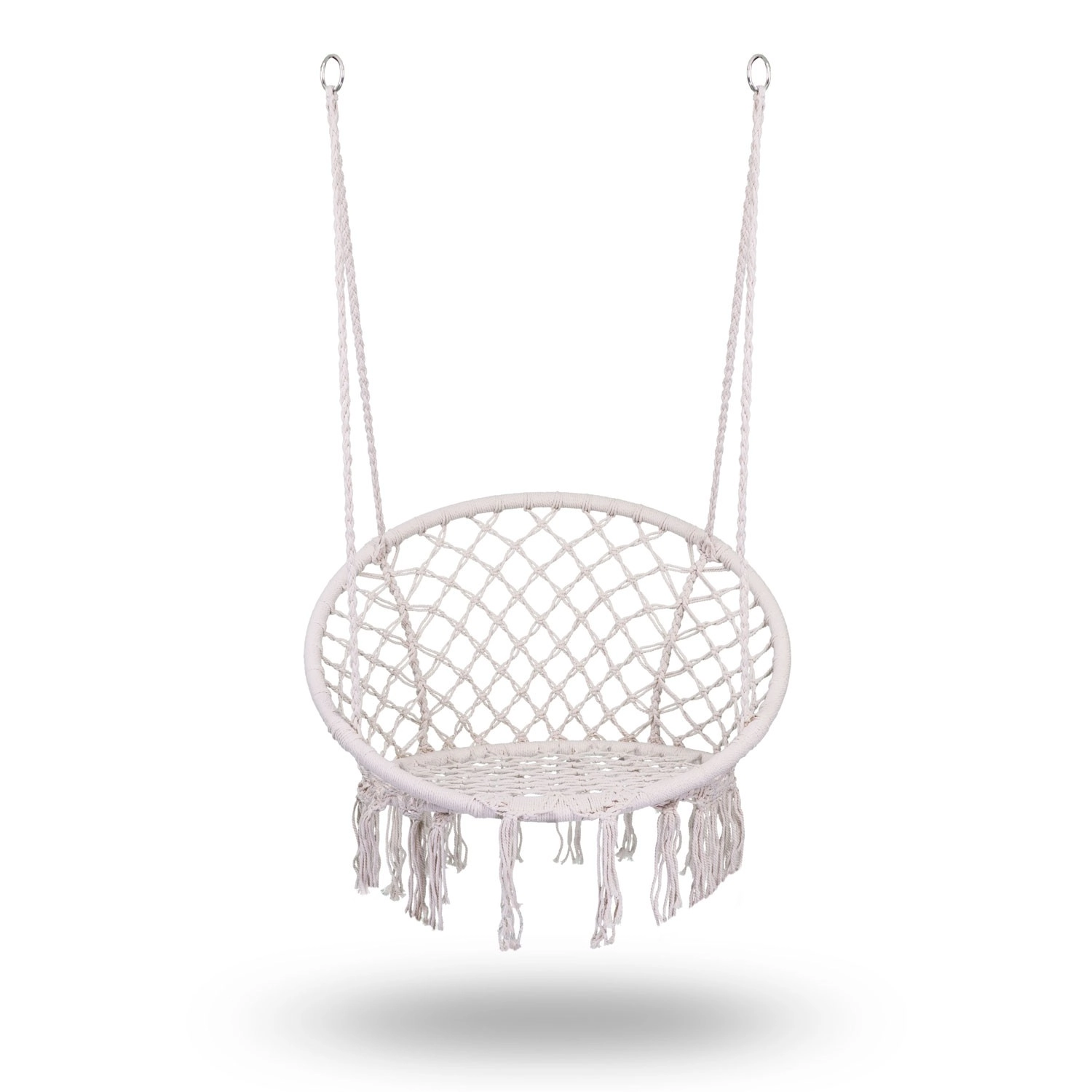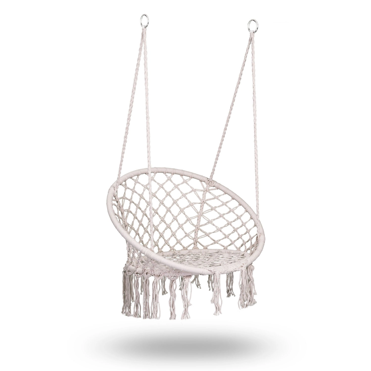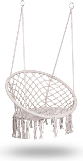 Profitez de la relaxation et du confort dans un élégant fauteuil suspendu boho de couleur beige. Une structure métallique robuste, des cordes de suspension à double tressage et une capacité de charge jusqu’à 150 kg garantissent un balancement en toute sécurité à l’intérieur comme à l’extérieur. L’assise large, le dossier haut et les franges macramé stylées apportent une atmosphère unique à votre intérieur comme à votre terrasse.