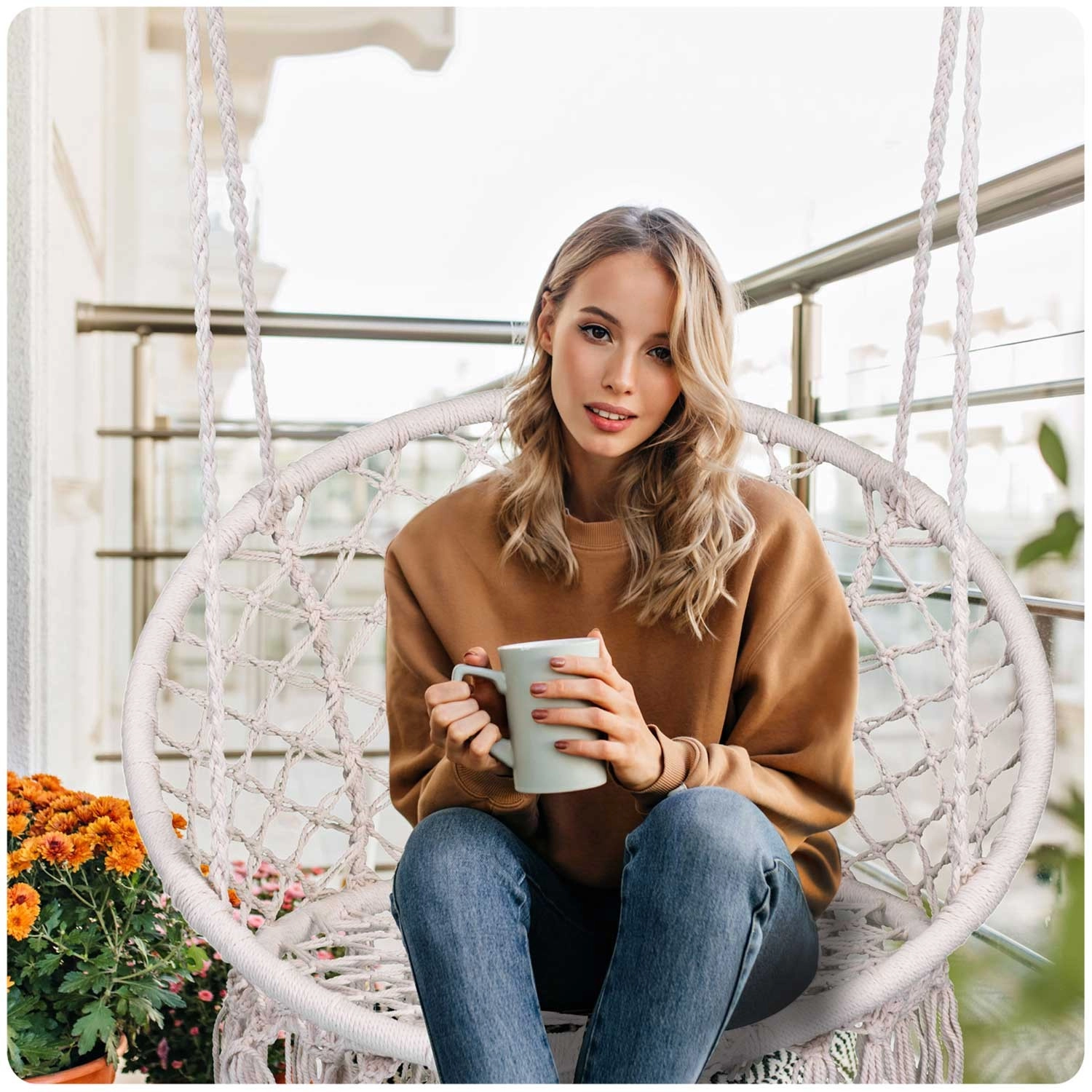 Le design beige élégant avec franges égaye le salon, la chambre, le balcon et le jardin. Le fauteuil se balance doucement et crée une atmosphère chaleureuse.