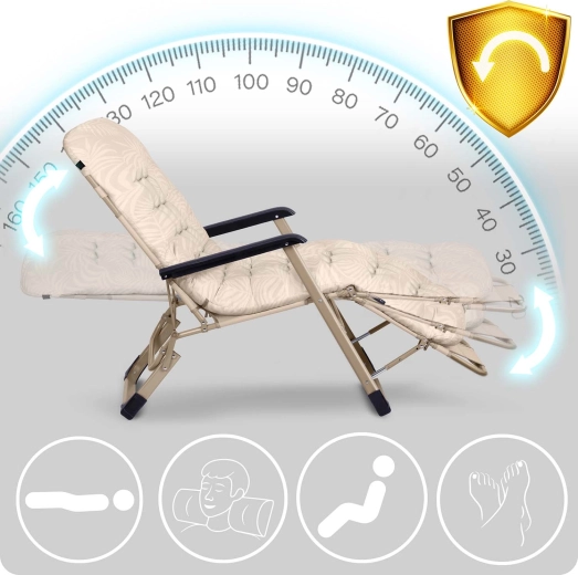 Le cadre robuste avec une capacité de charge de 120 kg est stable et résistant aux UV comme aux variations de température. Des accoudoirs en plastique résistant améliorent le confort, tandis que les embouts antidérapants sur les pieds assurent une bonne tenue sur différentes surfaces. Une fois pliées, les chaises longues prennent un minimum de place et se rangent aisément dans le coffre – idéales pour les vacances, au bord de la piscine ou à la plage.