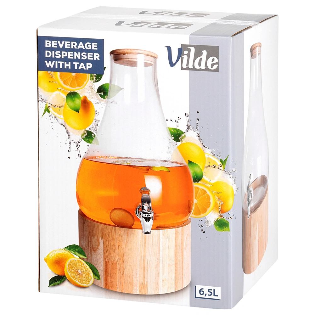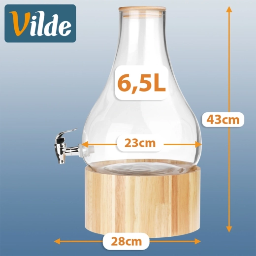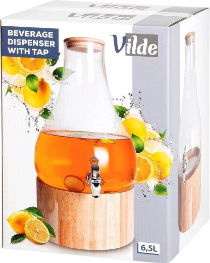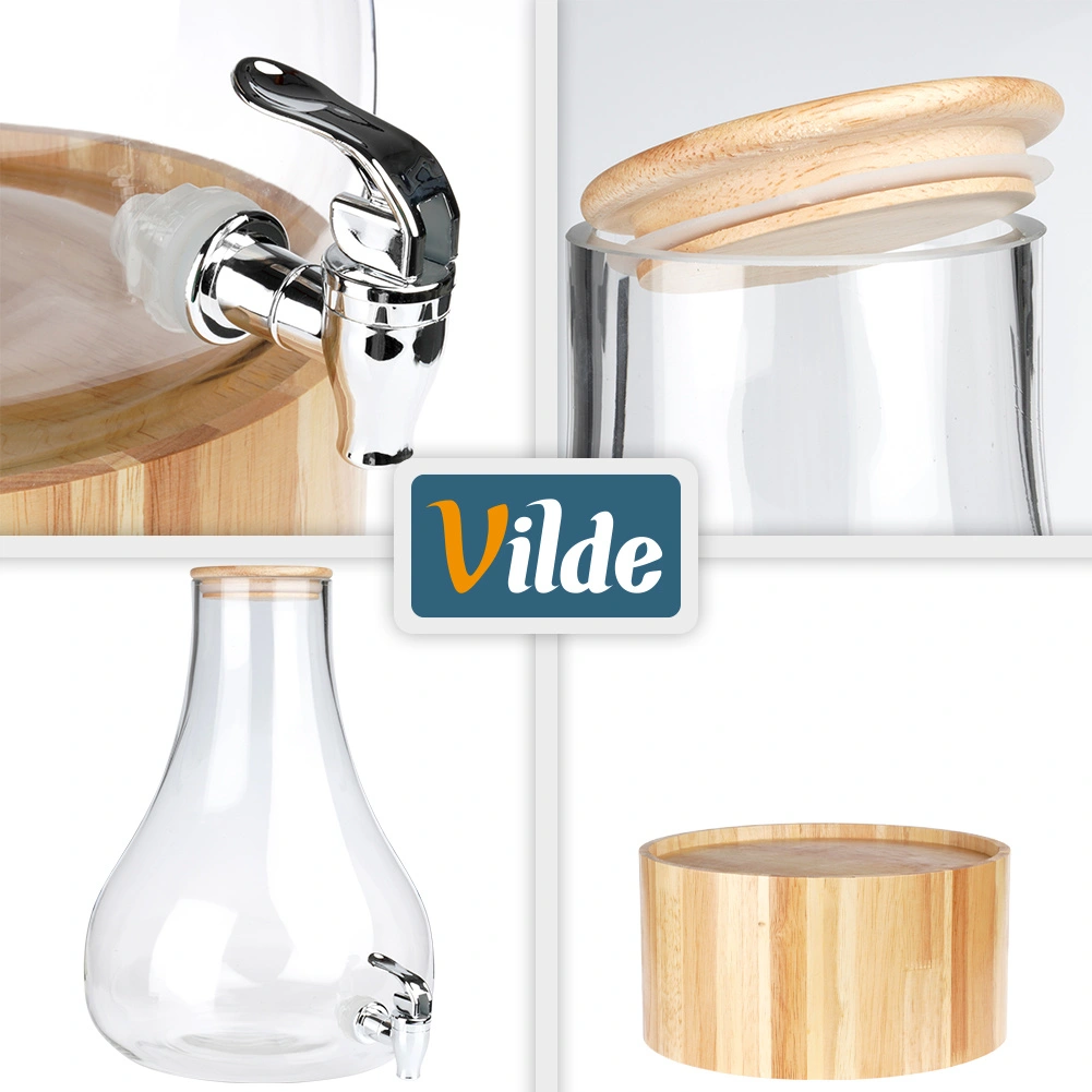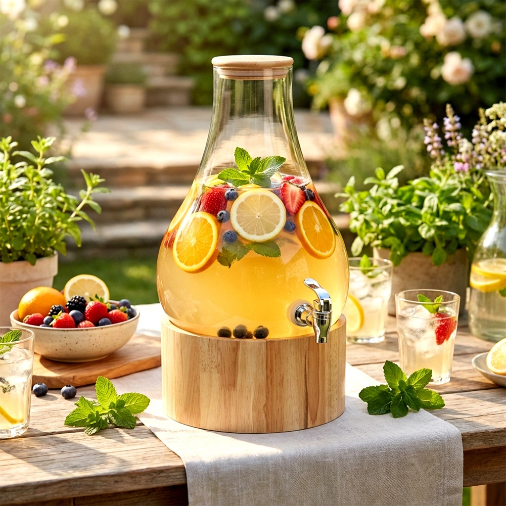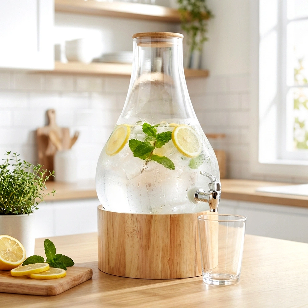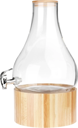 Distributeur élégant en verre de 6,5 l avec support en bois et couvercle en bambou, idéal pour servir des limonades, de l’eau ou des punchs. Grâce au robinet pratique et au support surélevé, le service est extrêmement confortable, tandis que le couvercle en bambou hermétique protège les boissons des impuretés et des insectes. Verre épais et résistant, utilisation facile et polyvalence pour les fêtes de jardin, la maison et la restauration.