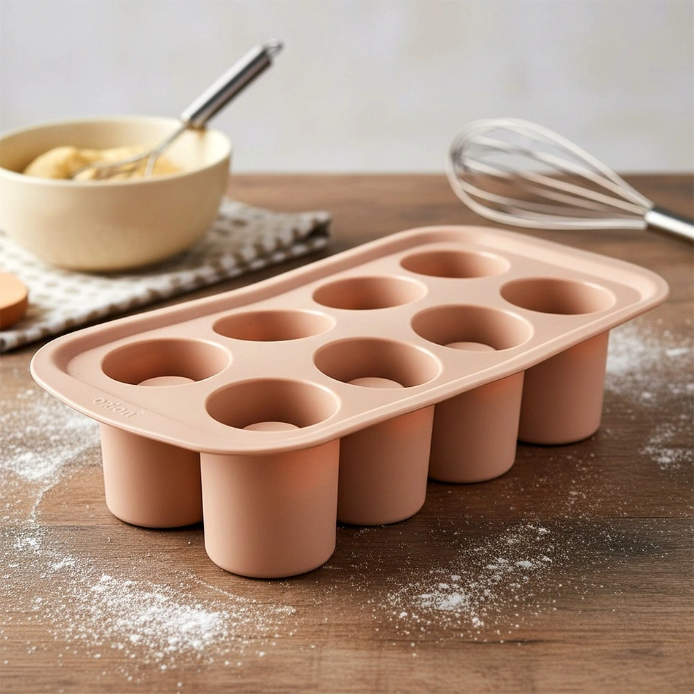 Moule en silicone pratique pour la cuisson et la congélation, idéal pour préparer des desserts spectaculaires, des mini gâteaux et des biscuits avec un centre creux pour crèmes, mousses ou liqueurs. Il offre 8 cavités de 4,5 cm de diamètre et 6 cm de hauteur, est flexible, antiadhésif et résistant de −40 °C à +200 °C. Convient au four, micro-ondes, réfrigérateur et congélateur et peut être lavé au lave-vaisselle.