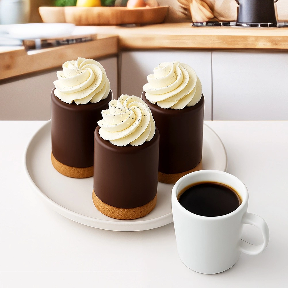 Les dimensions du moule sont de 26,5 × 13,5 × 6 cm, chaque cavité a un diamètre de 4,5 cm et une hauteur de 6 cm. Le matériau résiste aux températures de −40 °C à +200 °C, vous permettant d’utiliser un seul moule pour la cuisson, le refroidissement et la congélation. Entretien facile – le lave-vaisselle fait gagner du temps, et la surface antiadhésive facilite le nettoyage et le démoulage des desserts.