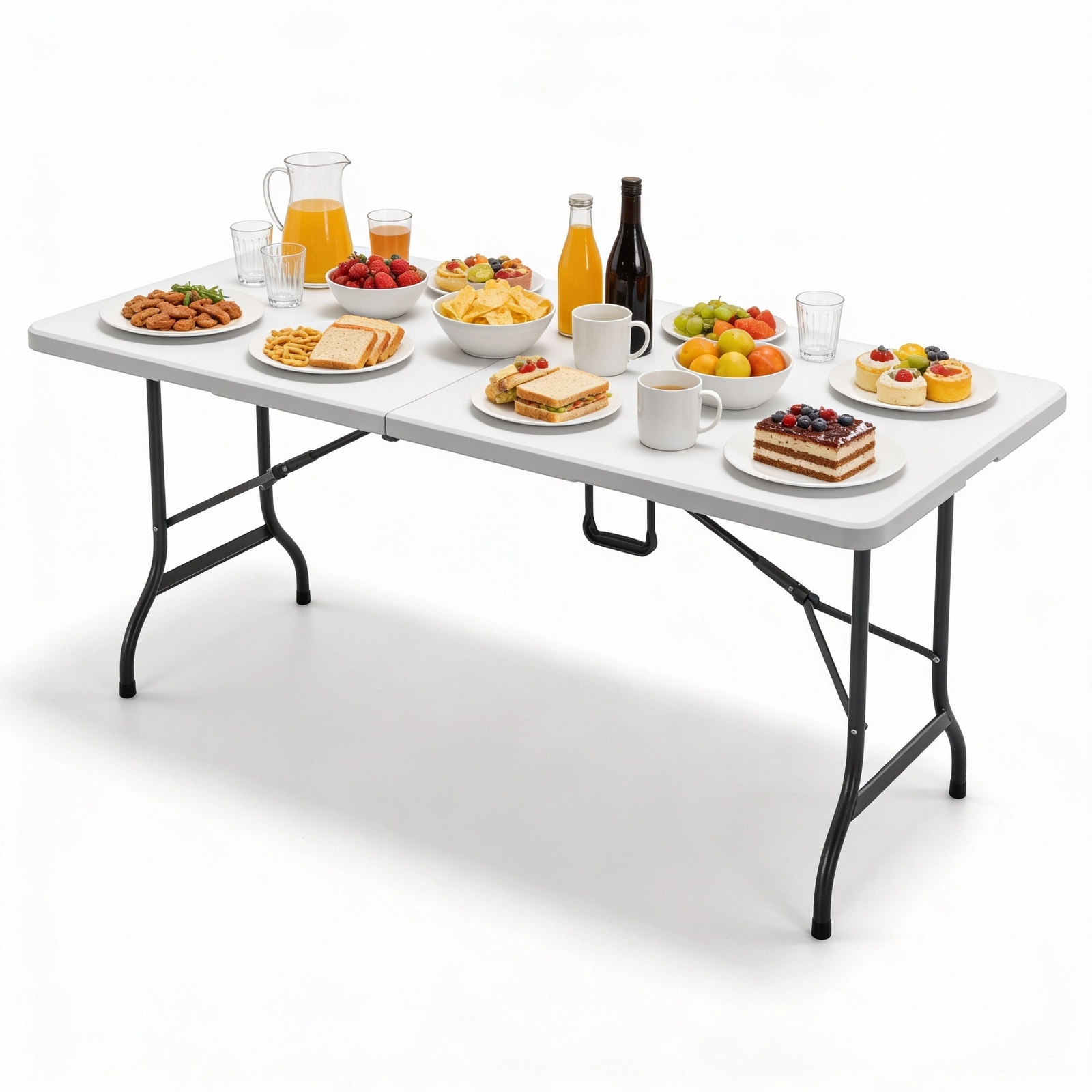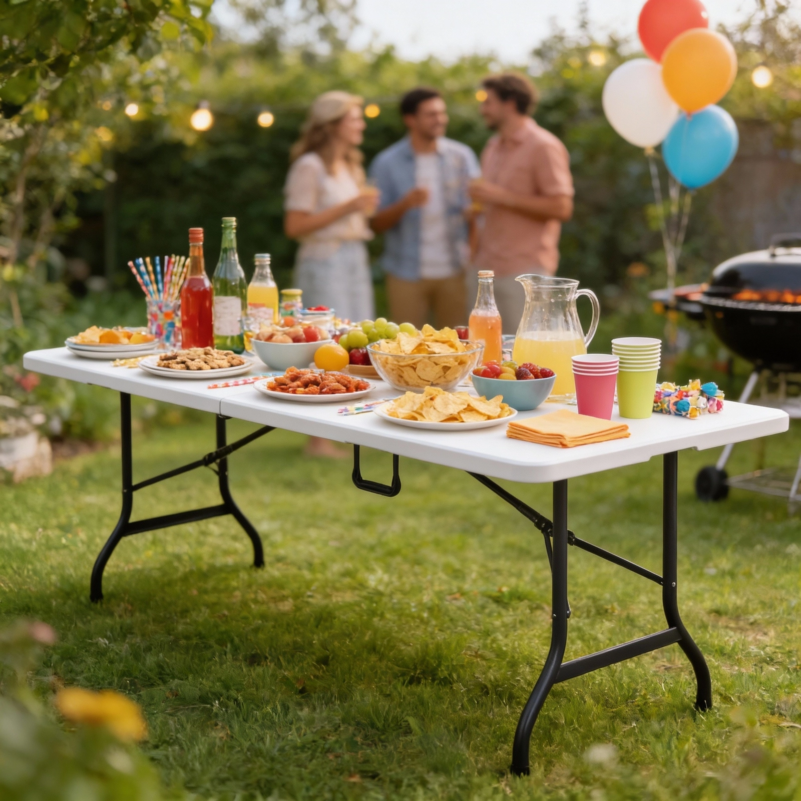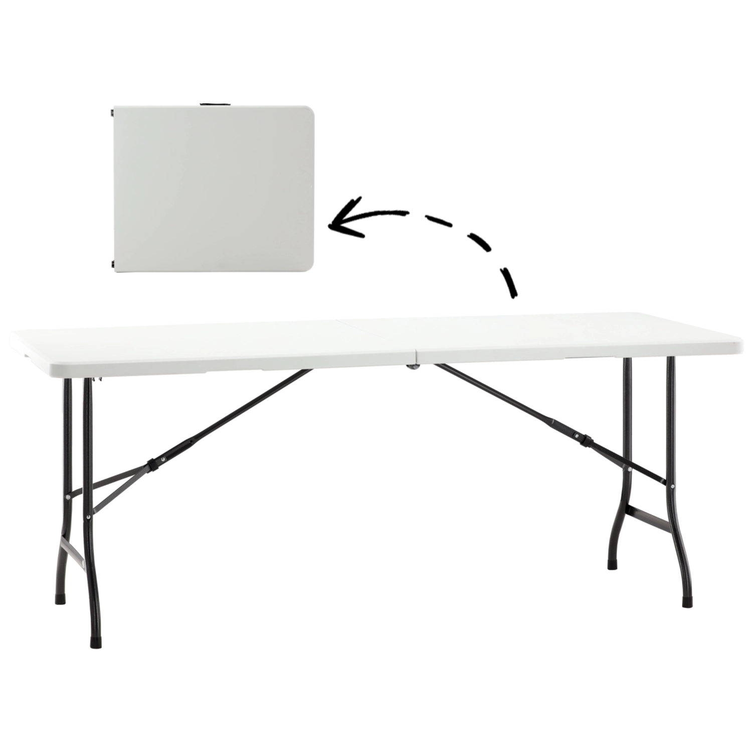 Table pliante universelle pour garden-parties, catering et camping, alliant confort, résistance et rangement facile. Plateau blanc en HDPE imperméable et structure métallique stable avec pieds verrouillables pour une assurance maximale lors de chaque événement – à la maison comme en extérieur.