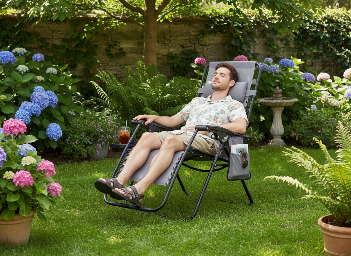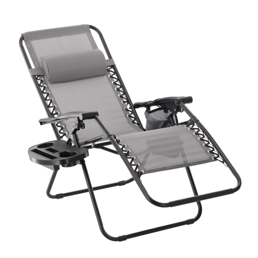 La pratique tablette latérale avec porte-boissons et espace pour le téléphone ou un livre garde tout à proximité. Une poche latérale offre un espace supplémentaire pour des lunettes, un magazine ou une crème solaire. Le cadre métallique stable et les multiples inclinaisons assurent le confort pour la lecture comme pour la sieste.