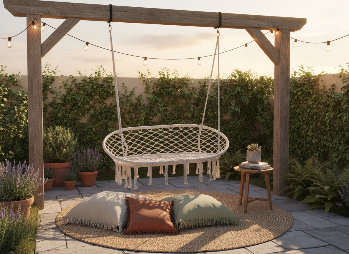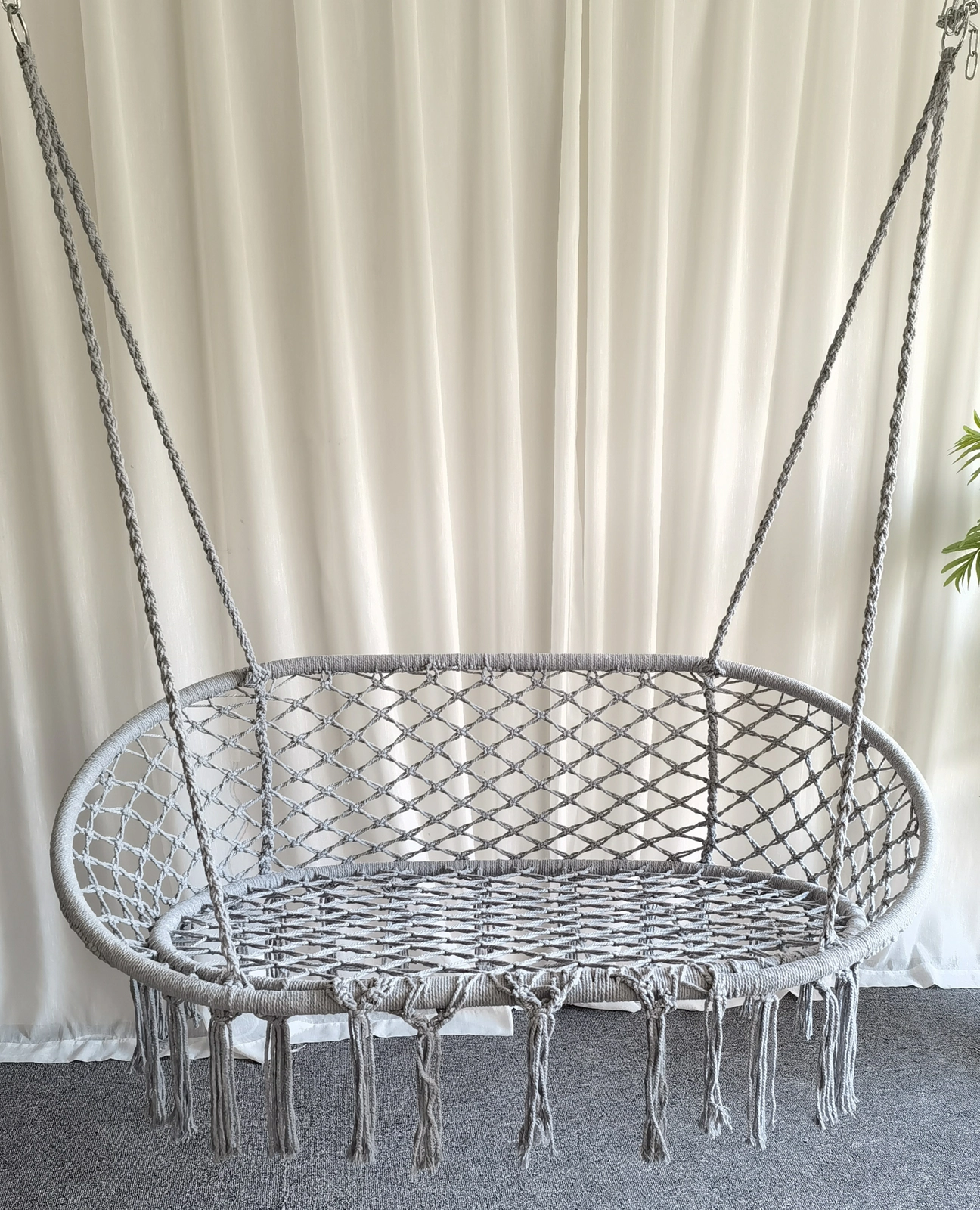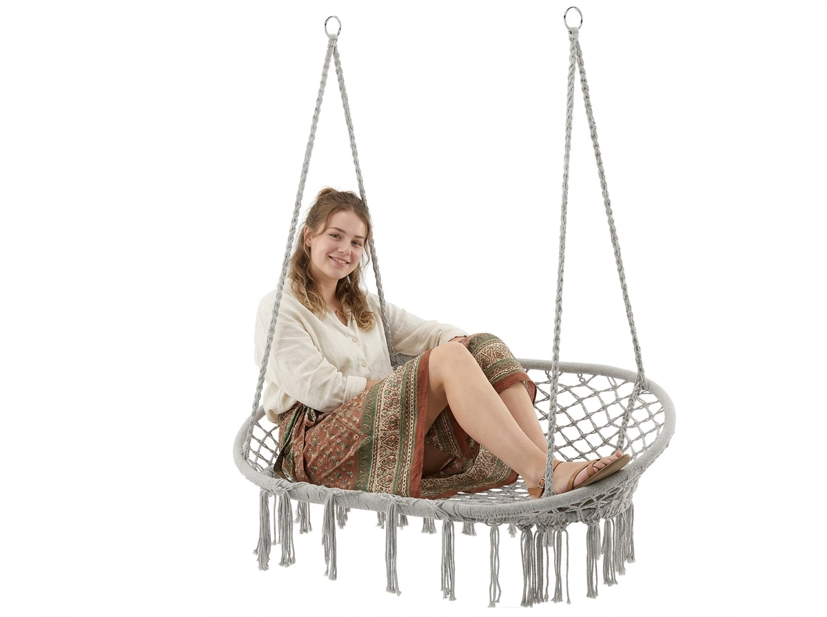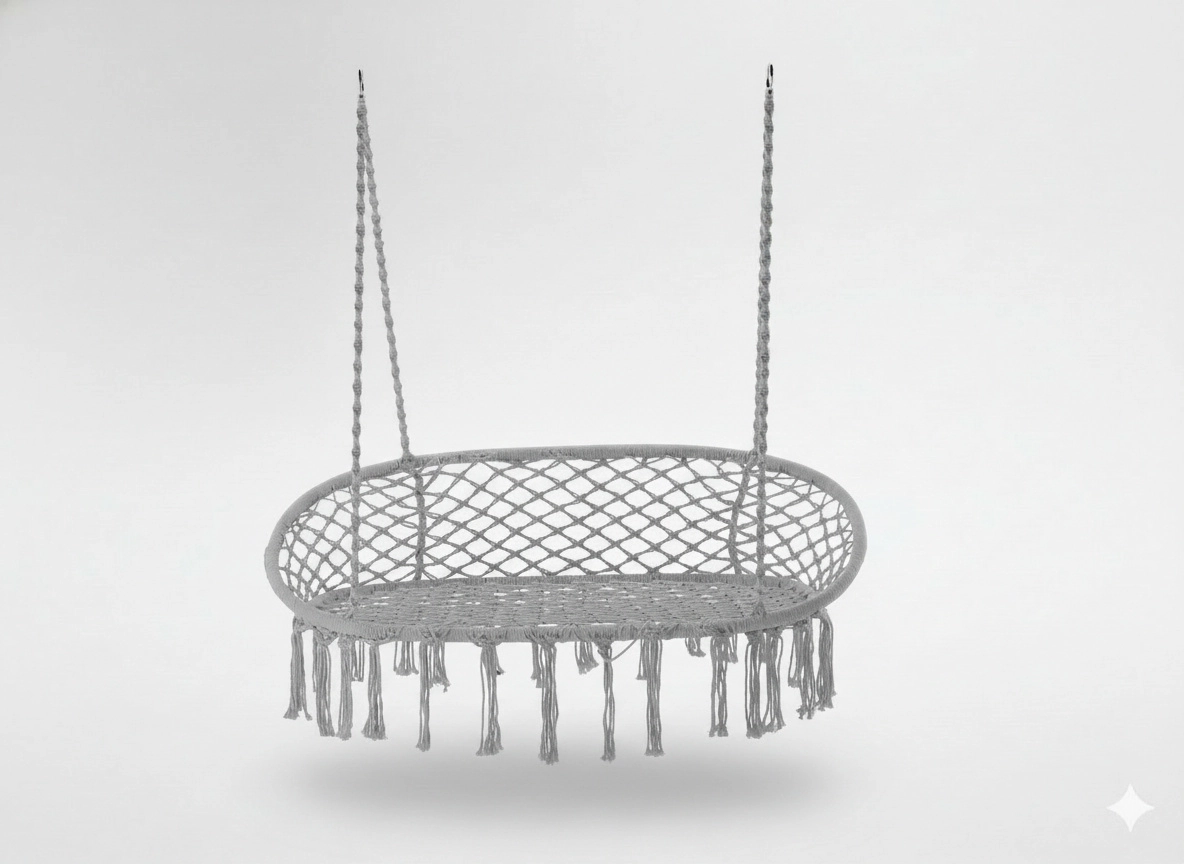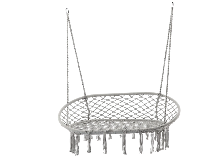 Offrez-vous un doux balancement et une relaxation à deux. Le siège spacieux de 110 × 62 cm et le tissu agréable en gris neutre créent un cocon idéal pour lire, boire un café ou se reposer après une journée chargée. Le cadre en acier revêtu par poudre assure solidité, stabilité et longue durée de vie.