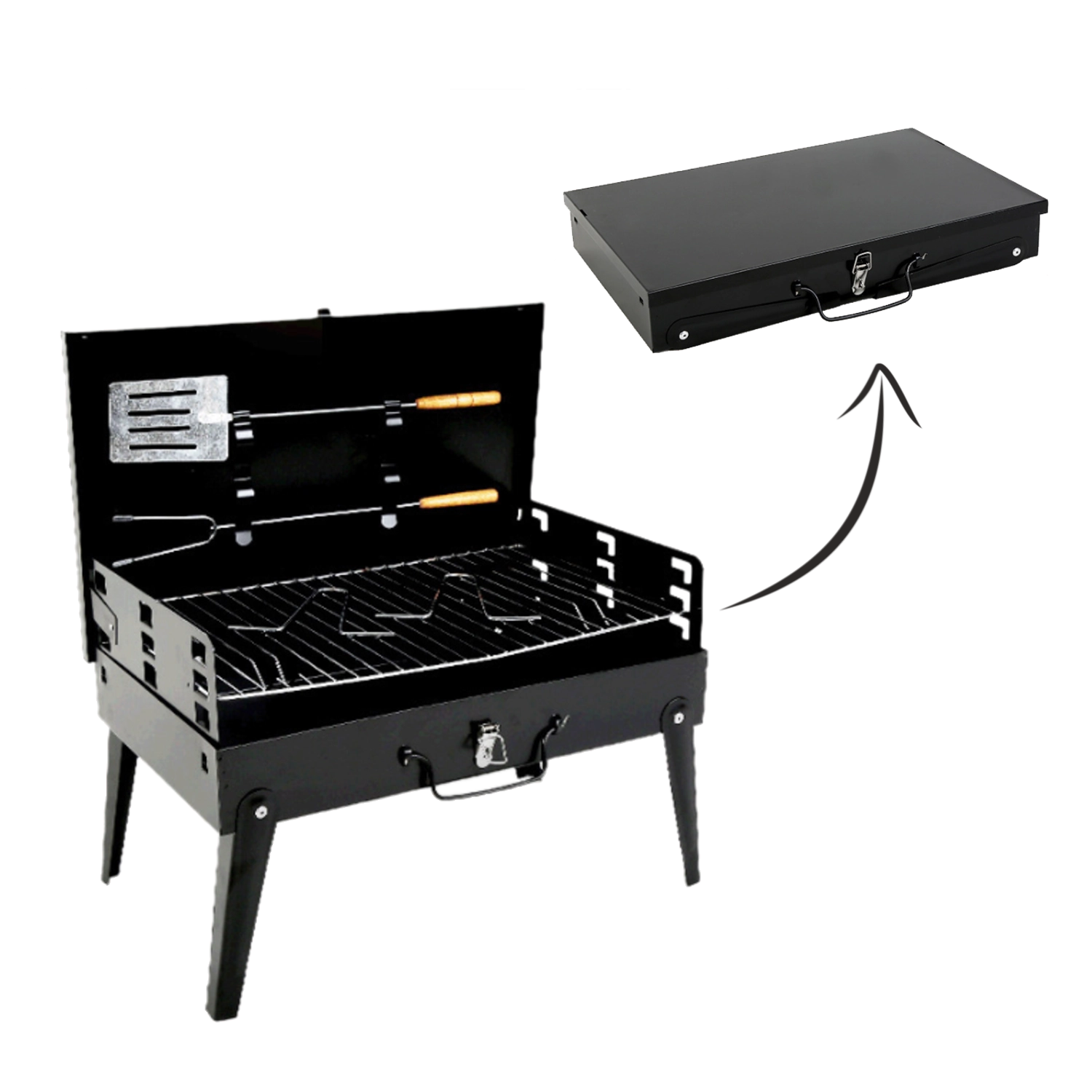 Barbecue à charbon de bois compact et portable au format pratique de valisette pour le camping, les pique-niques et le jardin. Grâce aux pieds pliables, au couvercle verrouillable et au set d’ustensiles intégré, griller partout devient confortable et sûr. Structure stable, montage rapide et transport facile font gagner de la place et du temps.