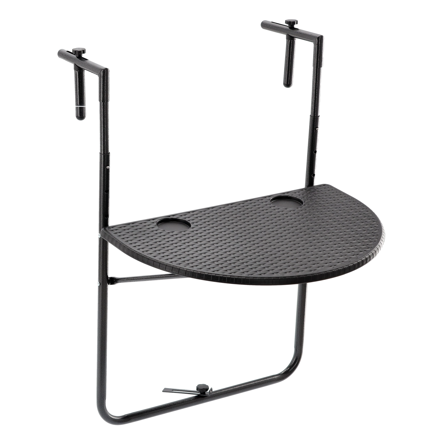 Pratique, la table de balcon suspendue fait gagner de la place et transforme même un petit balcon en coin cosy. Grâce à sa structure pliante, sa forme demi-ronde et sa hauteur réglable 73–78,5–83,5 cm, profitez d’un vrai confort pour le café, le travail ou la détente. La structure métallique résistante et le plateau à aspect rotin noir sont élégants et faciles à entretenir.