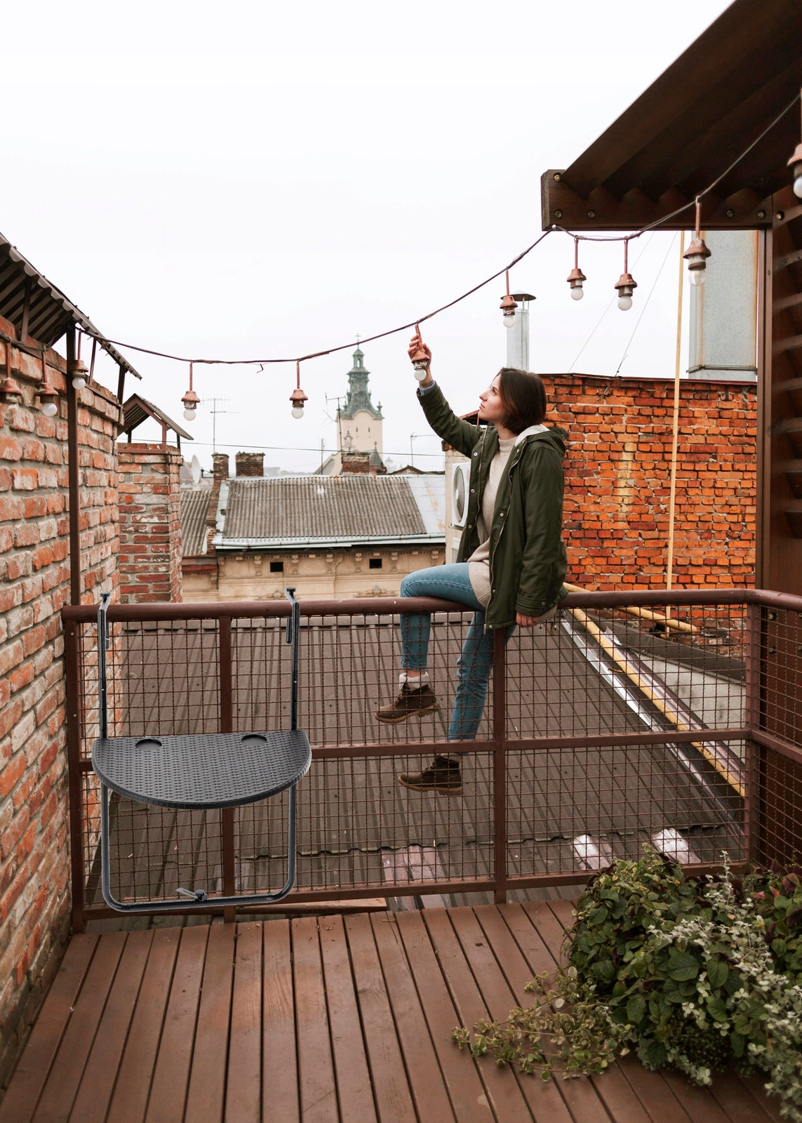 Après usage, rabattez simplement la table contre la rambarde. Idéal pour les petits balcons où chaque centimètre compte.
