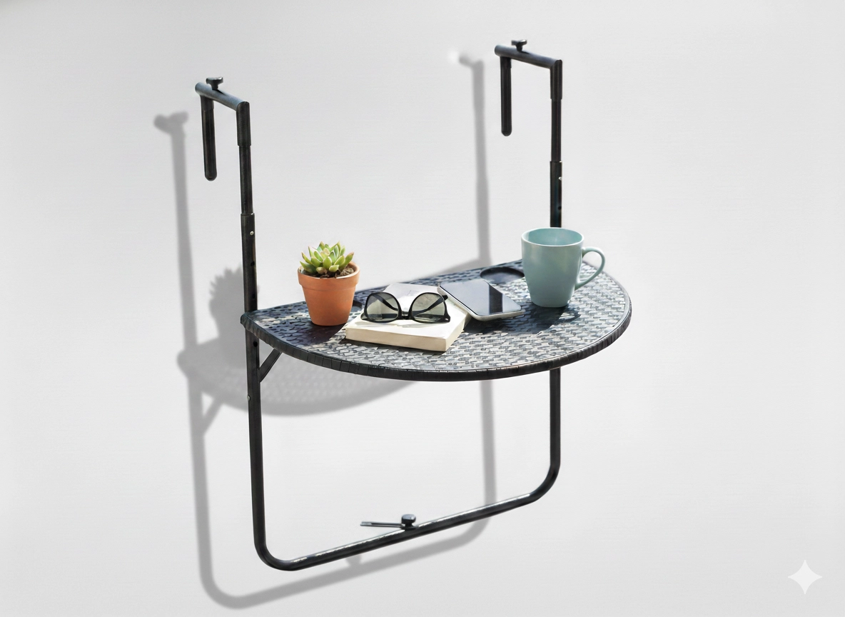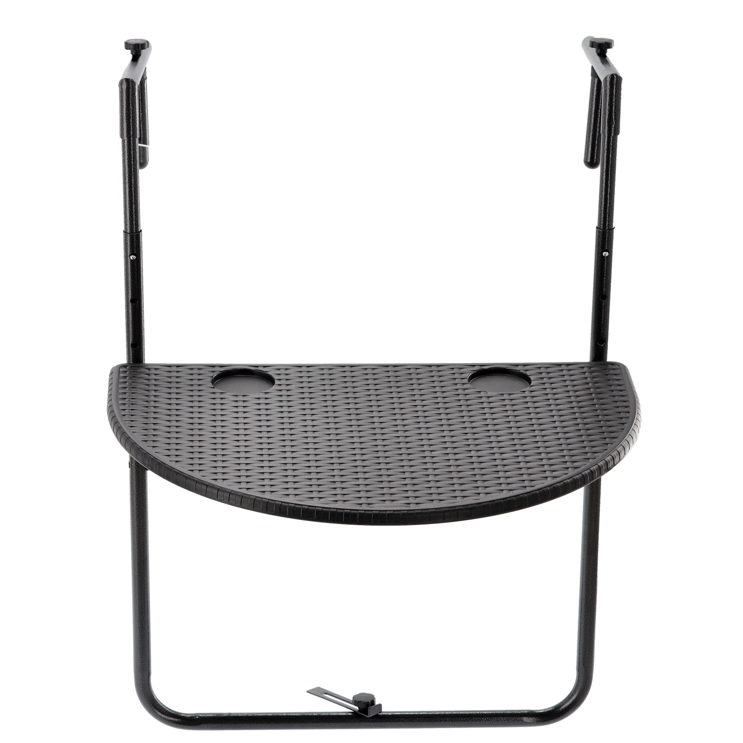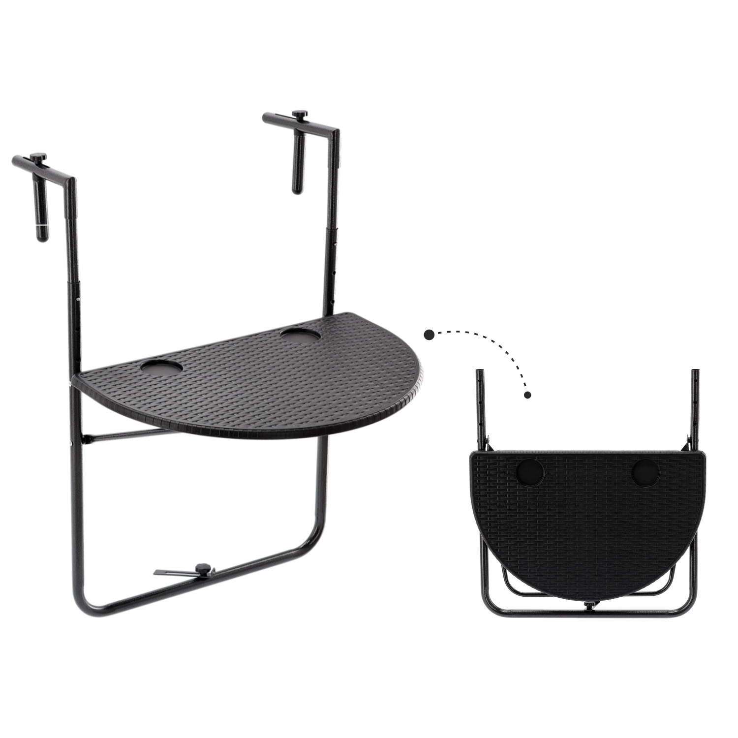 La table suspendue se fixe facilement sur la rambarde du balcon à l’aide de supports réglables. Sa forme demi-ronde optimise l’espace, tandis que les ouvertures intégrées pour boissons maintiennent les verres bien en place. Après utilisation, rabattez la table d’un seul geste – une solution idéale pour les petits balcons.
