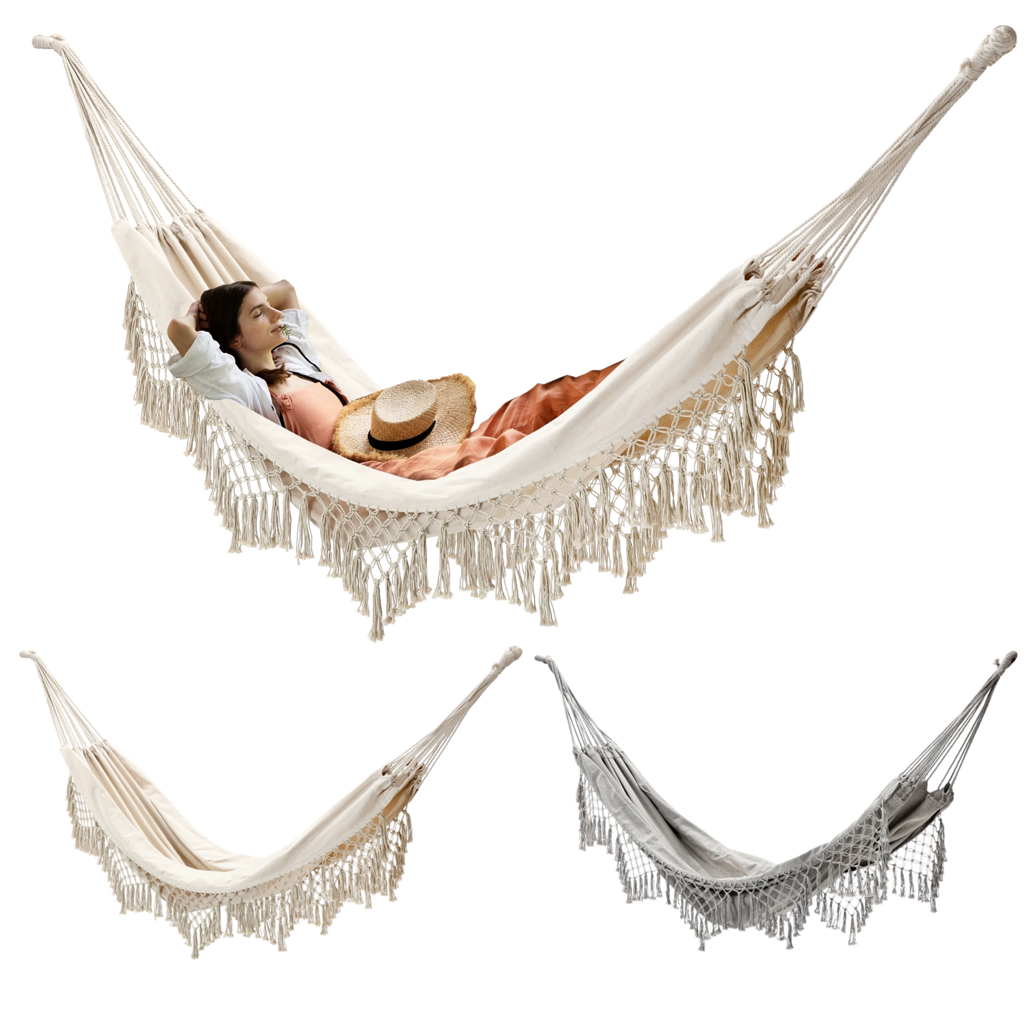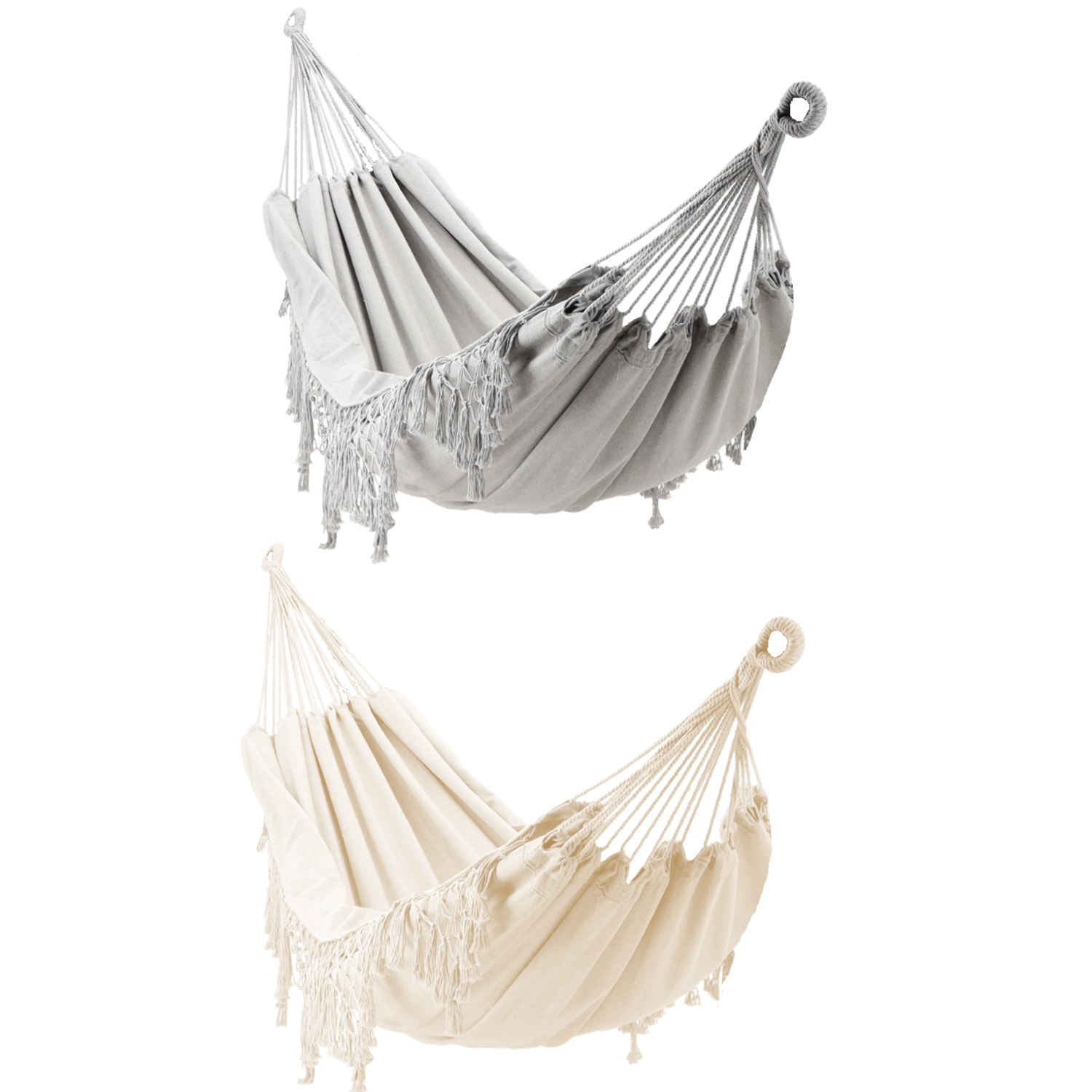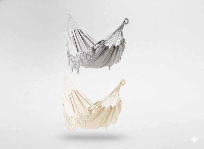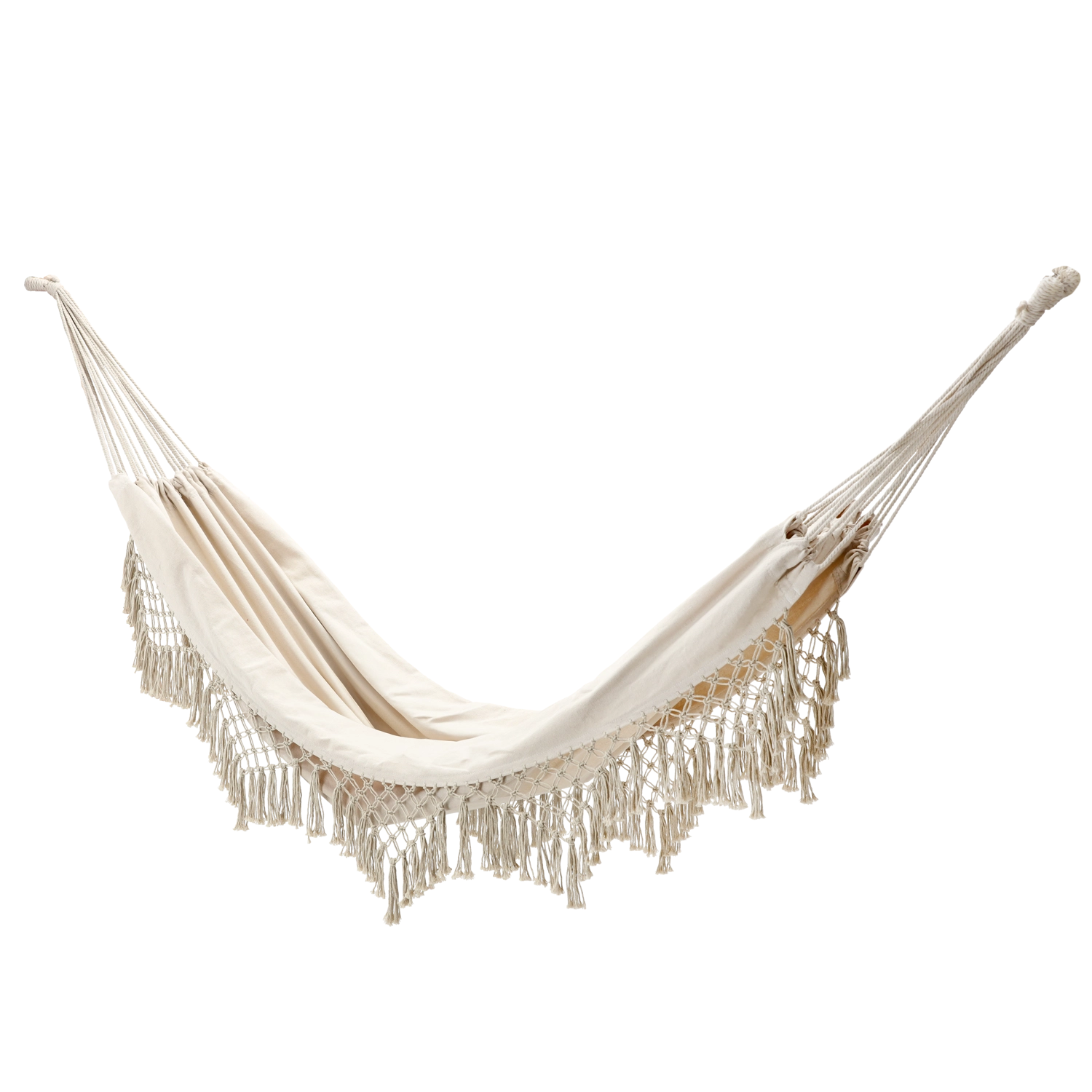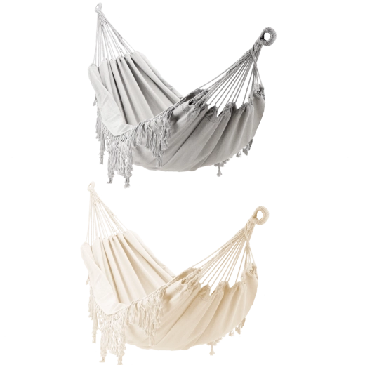 Ce hamac stylé avec franges au design boho apporte sérénité et légèreté à votre espace. La toile tendue est agréable au toucher tout en étant suffisamment robuste pour une détente quotidienne, à l’extérieur comme à l’intérieur.