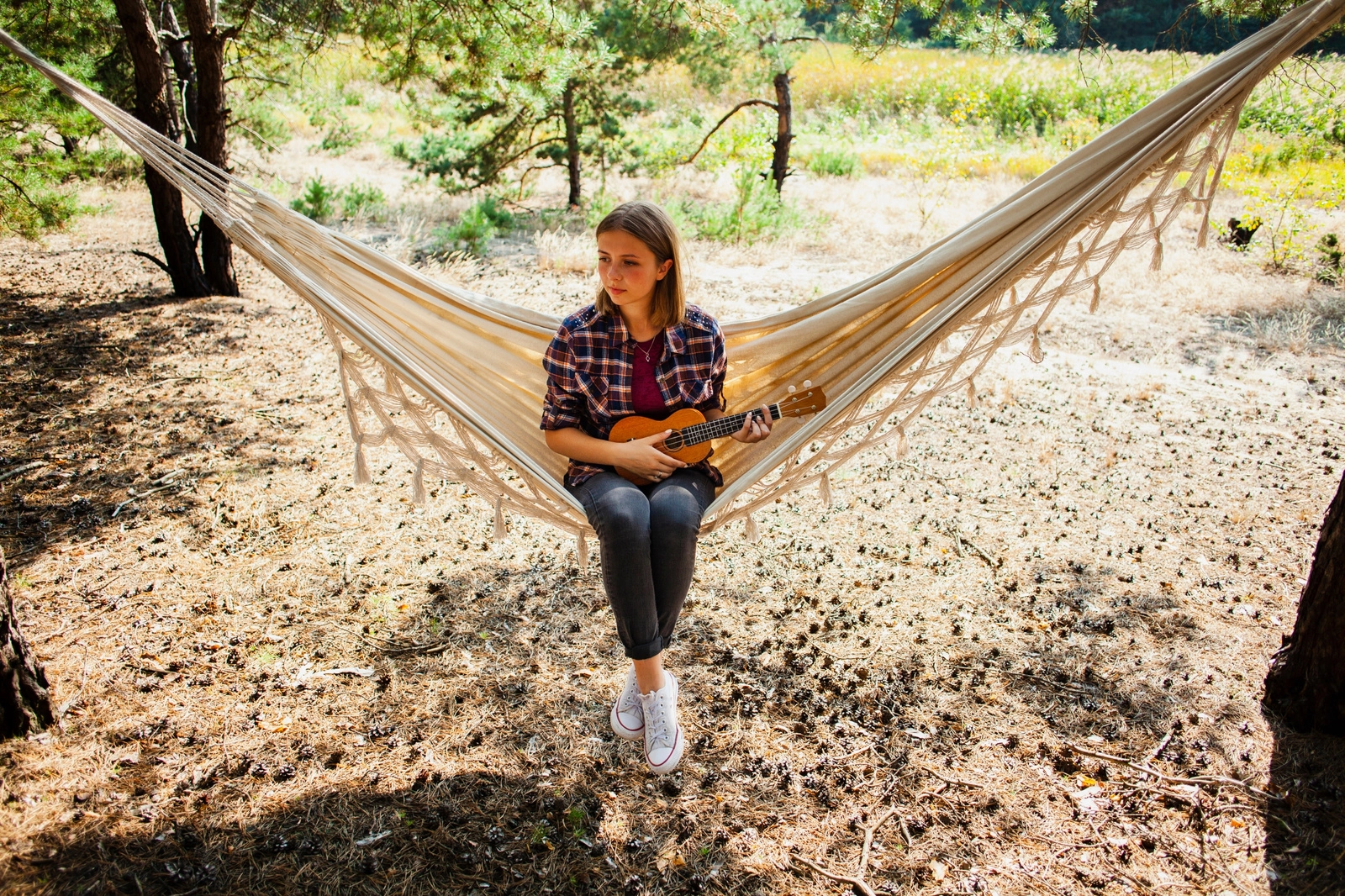 Les attaches tressées multibrins avec œillets répartissent la charge uniformément et augmentent la sécurité ainsi que la durabilité du hamac.