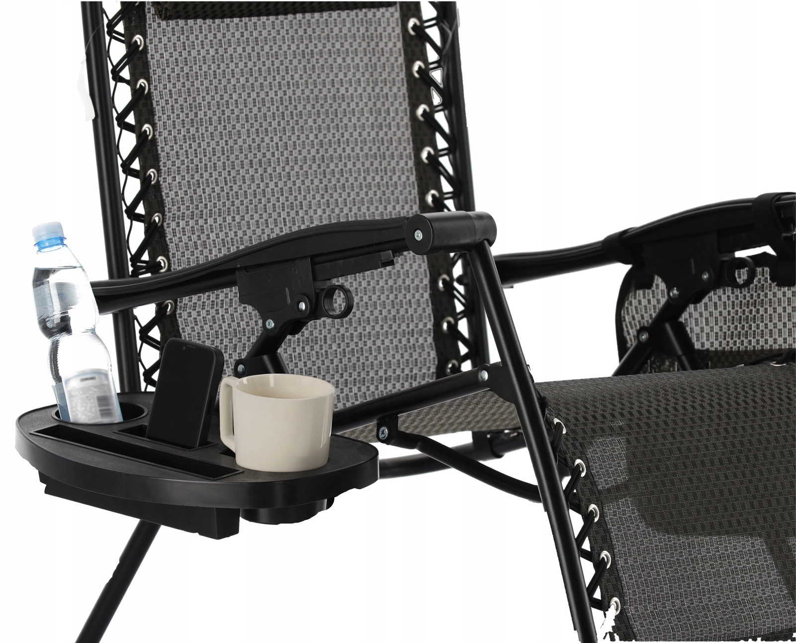 L’équipement pratique comprend une tablette amovible avec porte‑gobelet et emplacement pour téléphone, ainsi qu’une poche latérale pour les petits objets. L’appuie‑tête réglable soutient la nuque et la tête, tandis que le repose‑pieds ajustable soulage les jambes après une longue journée.