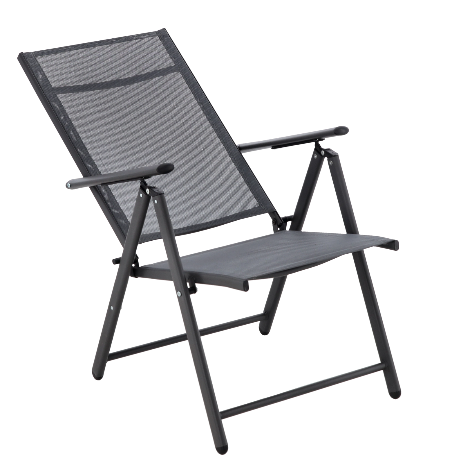 Élégante chaise de jardin grise en acier thermolaqué offrant une structure durable, un dossier réglable en 7 positions et une maille respirante pour un confort maximal sur la terrasse, le balcon ou au jardin. Son design pliable garantit un transport aisé et un rangement peu encombrant.