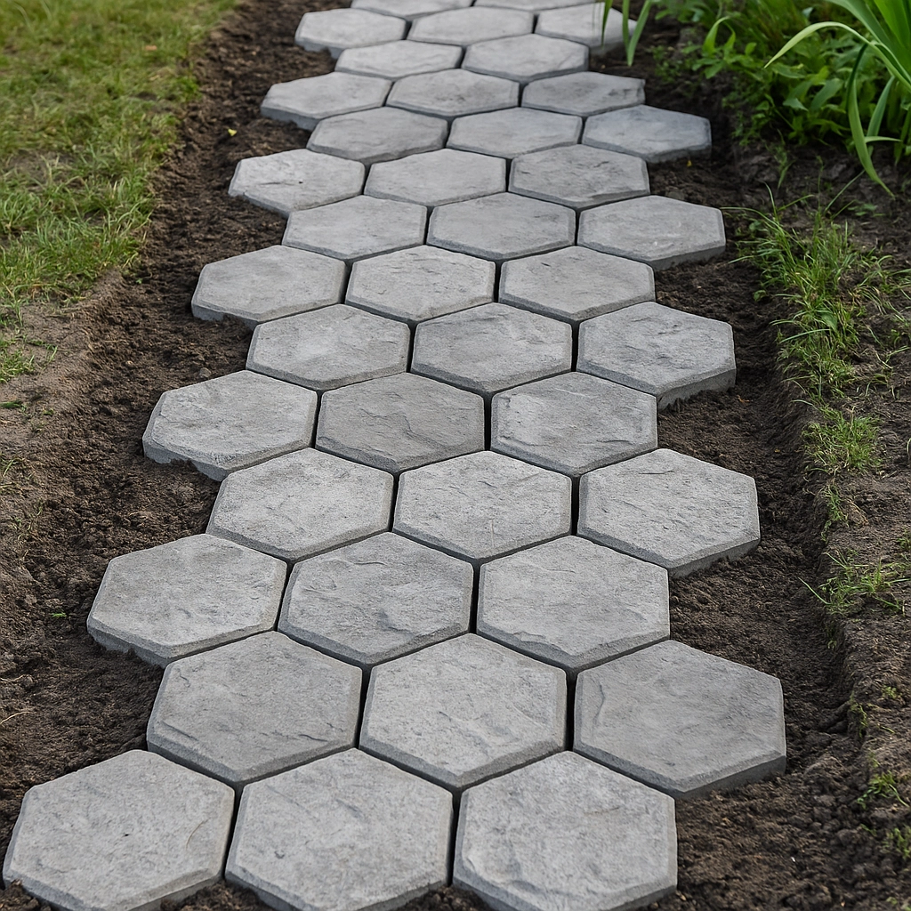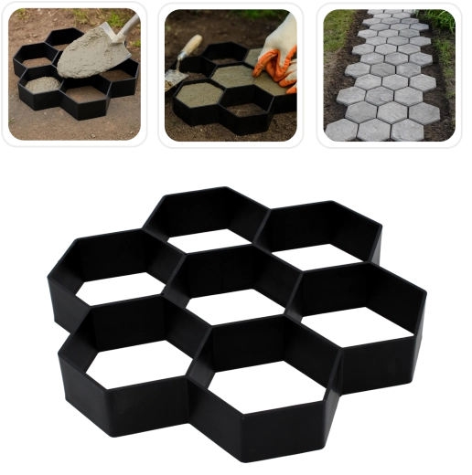 Le moule est conçu pour un coulage du béton rapide et propre. Il suffit de le poser sur le support, de remplir avec le mélange, de lisser, puis, après la prise initiale, de le soulever – la forme se répète facilement et se compose en divers motifs. Grâce à ses dimensions universelles 29 × 29 × 4 cm, vous concevez aisément un chemin adapté à l’espace et au style de votre jardin.