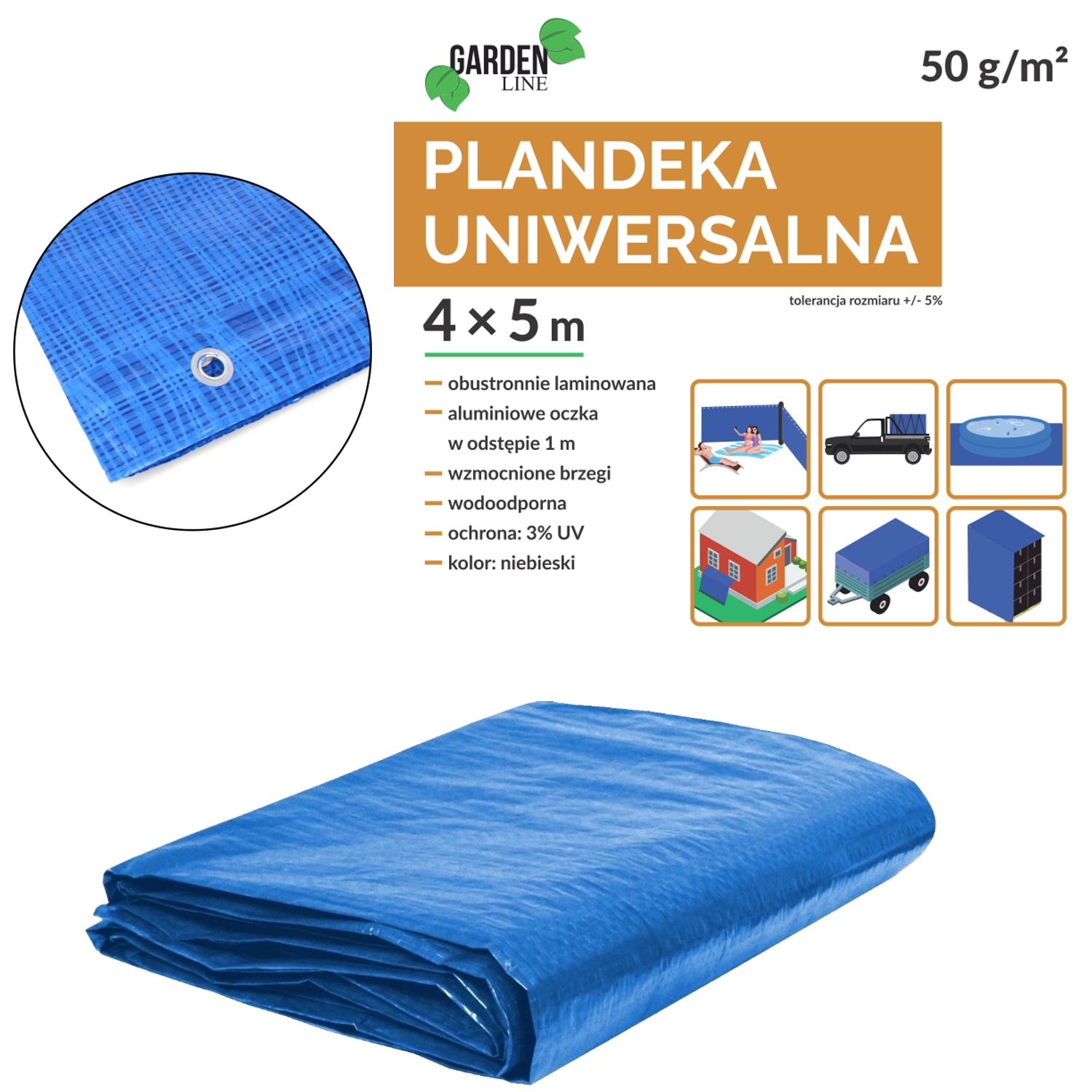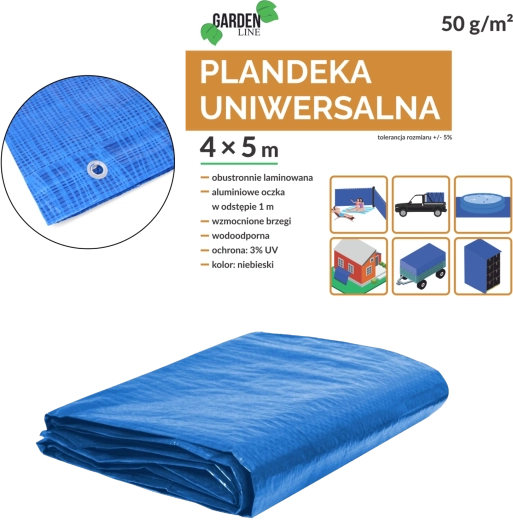 Bâche bleue légère et pratique en PE résistant pour un usage polyvalent. Offre une protection imperméable et laminée des deux côtés avec bords renforcés et œillets métalliques tout autour. Idéale pour couvrir le bois, les meubles, les matériaux de construction ou comme sous-couche au sol. Grammage 50 g/m², dimensions 5 × 4 m (+/− 5 %), avec stabilisation UV 3 %.