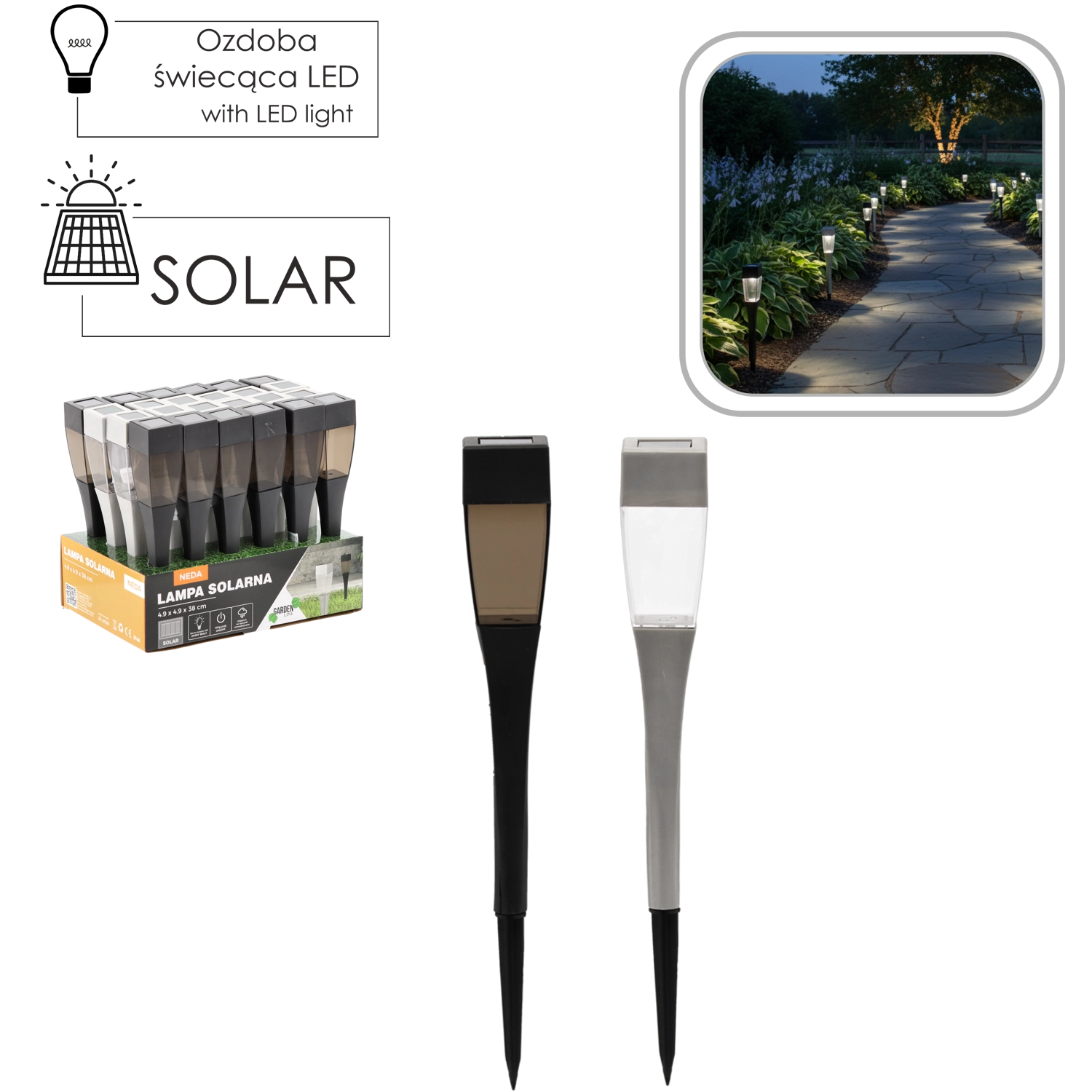 La lampe LED solaire de jardin Neda au design élégant offre un éclairage sans fil pour les allées, entrées, terrasses et massifs. Grâce à son alimentation solaire et à son fonctionnement automatique, elle s’allume après la tombée de la nuit avec une lumière blanc froid, est résistante aux intempéries (IP44) et s’installe facilement en la plantant dans le sol.