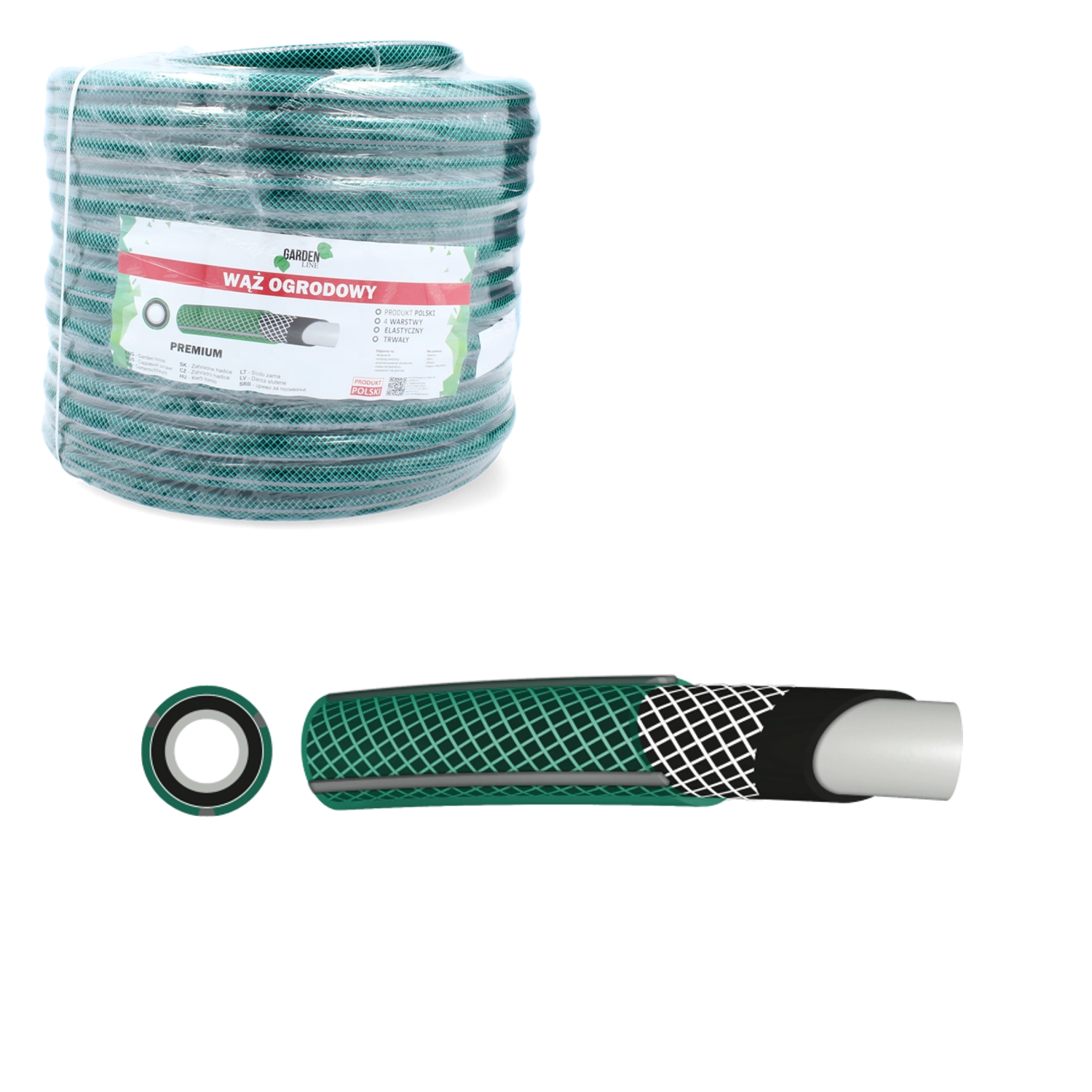 Tuyau d’arrosage Premium résistant, longueur 20 m et diamètre 3/4", pour une utilisation intensive. Structure à 4 couches en PVC souple avec renfort textile assurant une haute résistance aux dommages mécaniques. Pression de service 8 bar (20 °C), pression d’éclatement > 24 bar (20 °C). Fonctionnement fiable entre -10 °C et +60 °C. Fabriqué en Pologne.