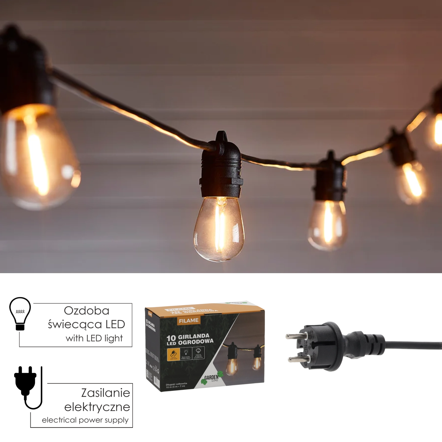 Une répartition pratique de la longueur 10 m (3 m d’alimentation + 7 m avec lumières) et un espacement des ampoules de 0,7 m garantissent un éclairage homogène. Les ampoules LED E27 1 W économes réduisent la consommation d’énergie tout en offrant une lumière douce et agréable. Avec la possibilité de connecter jusqu’à 120 ensembles, vous pouvez facilement illuminer de grands espaces.