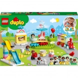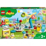 Emmenez les enfants pour une journée pleine de merveilleux souvenirs dans le parc d'amusement LEGO DUPLO. Vous y trouverez de nombreux éléments attrayants destinés au divertissement et à l'apprentissage. Cet ensemble de jeu polyvalent comprend des toboggans, un carrousel mécanique, une grande roue, un train, des stands vendant des hot dogs et des glaces et bien d'autres accessoires.