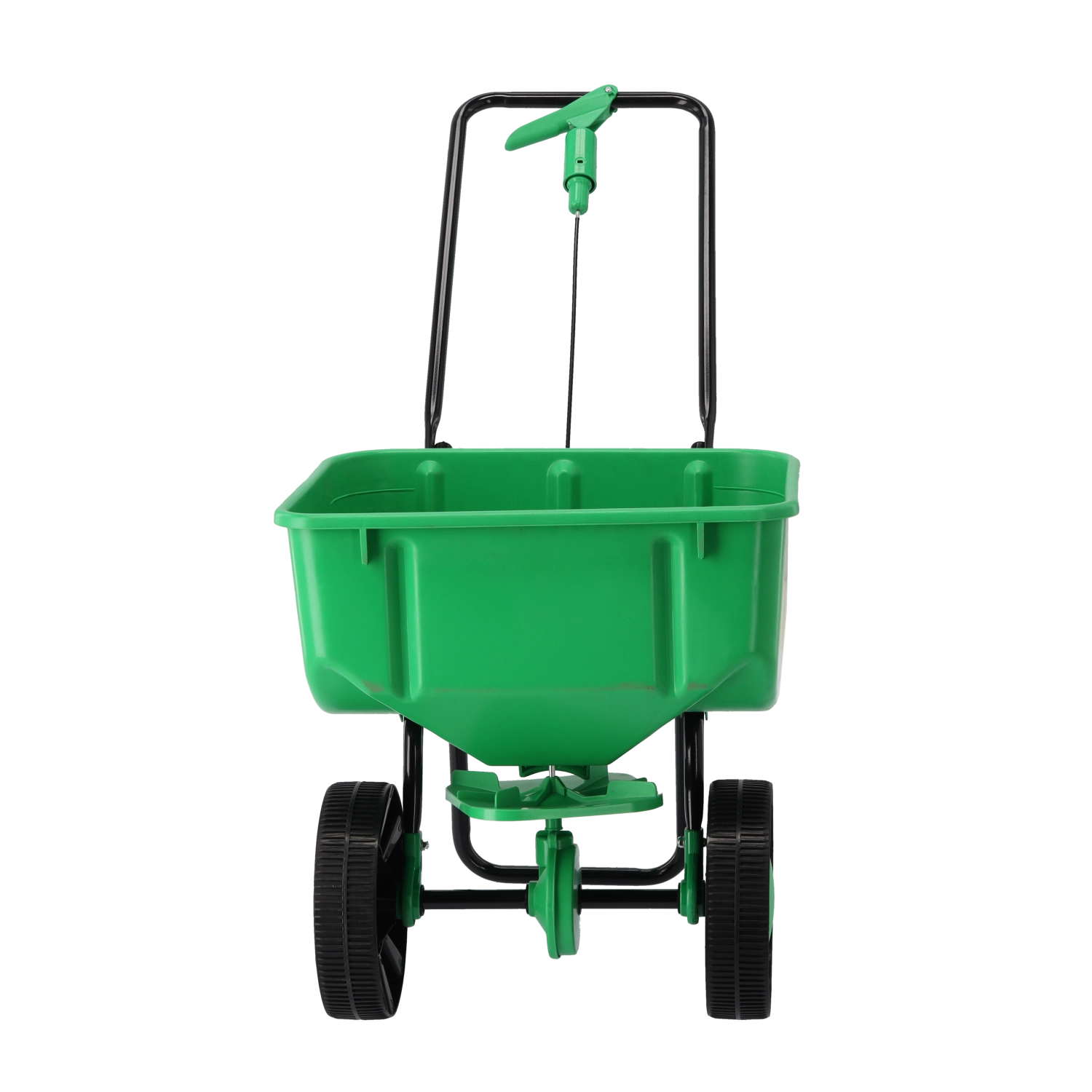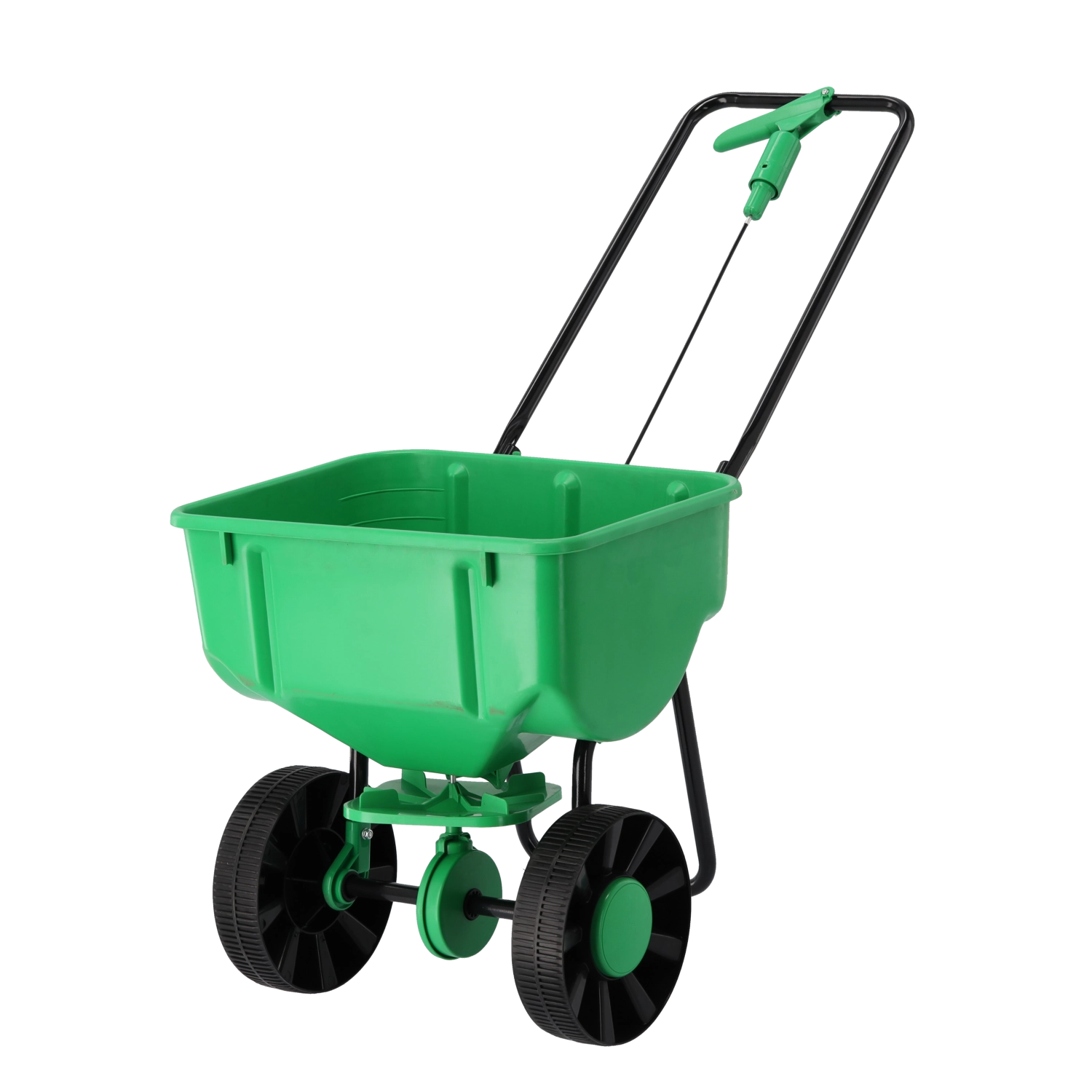 Les grandes roues assurent un déplacement fluide et une bonne stabilité, tandis que le levier près de la poignée permet un réglage précis du débit pour une répartition homogène.