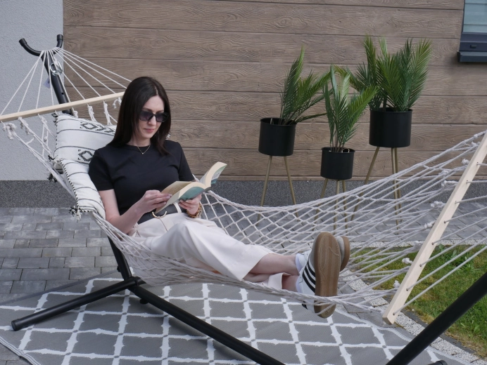 • Stabilité et largeur : les barres d’écartement maintiennent le hamac ouvert et confortable.