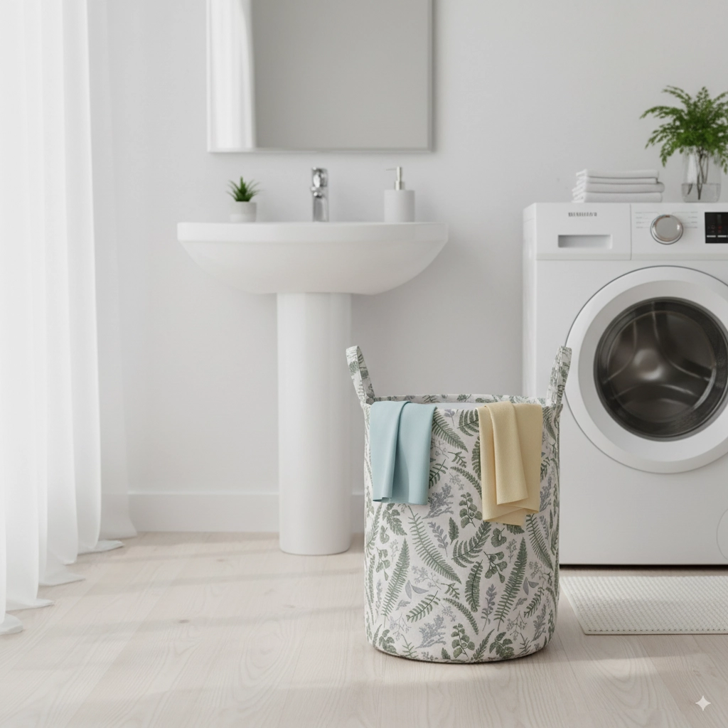 Le panier est pliable pour un rangement compact hors saison et ses poignées latérales robustes facilitent la manipulation. Sa teinte neutre avec imprimé feuillage s’harmonise à merveille avec les intérieurs scandinaves, modernes ou d’inspiration naturelle — de la chambre et la buanderie jusqu’à la chambre d’enfant.