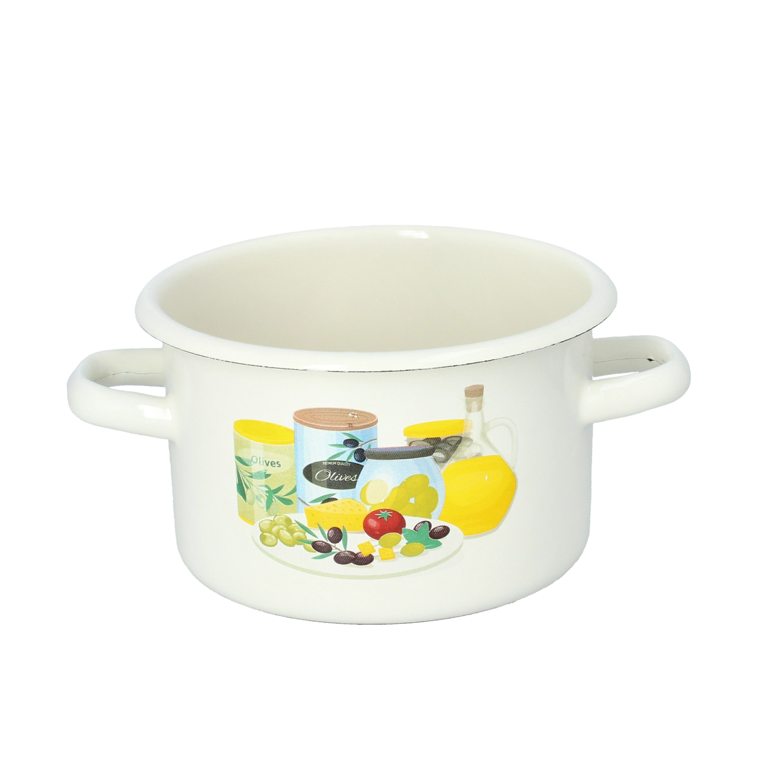 Découvrez une casserole émaillée polyvalente de 2 litres, parfaite pour préparer des soupes, des sauces ou réchauffer de petites portions. Sa surface émaillée de qualité est hygiénique, facile à nettoyer et résistante aux rayures. La finition crème avec motif olives apporte style et fraîcheur à votre cuisine.