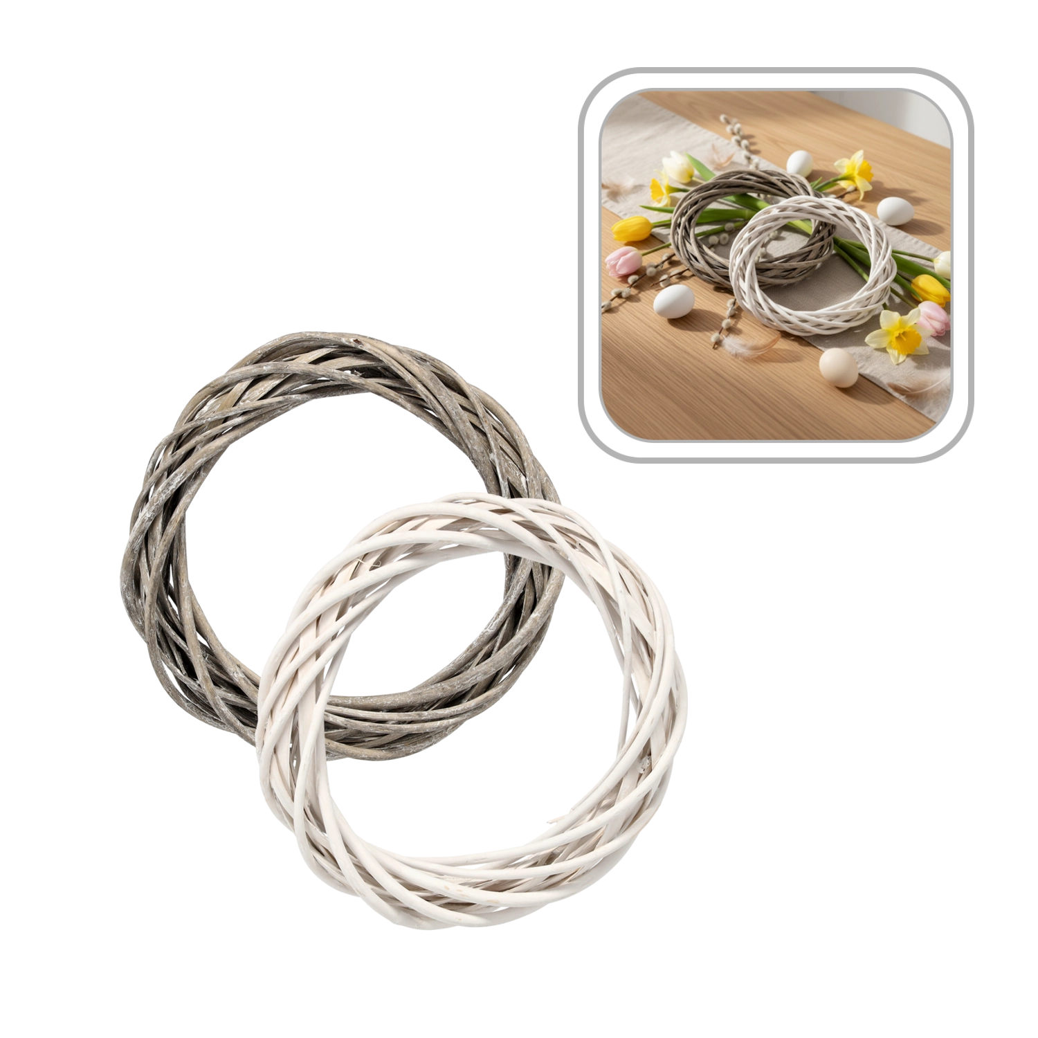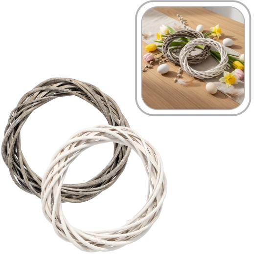 Cette couronne polyvalente en osier naturel convient parfaitement comme décoration autonome ou comme base pour des compositions originales. Sa teinte neutre, blanche ou grise, se marie aisément avec des fleurs, des rubans et des ornements saisonniers, vous permettant de créer des compositions printanières, pascales, de mariage ou de Noël uniques.