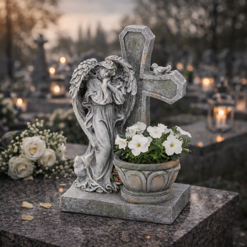 La statuette est idéale pour être placée sur une tombe, un mémorial ou dans un coin du jardin. La jardinière permet d’ajouter des fleurs naturelles ou artificielles, soulignant ainsi le souvenir personnel et le symbole de foi.