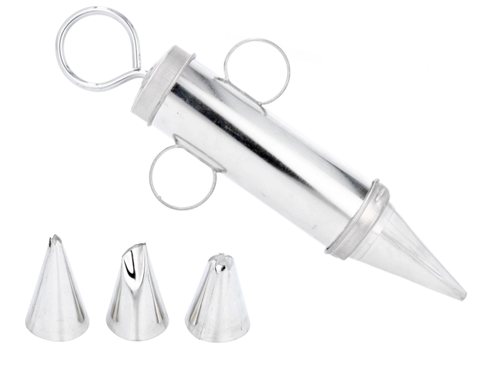 Décorateur pour gâteaux et pâtisseries, pratique et résistant, qui vous aide à obtenir un aspect professionnel aussi bien à la maison qu’en usage pro. Fabriqué en tôle galvanisée, compatible contact alimentaire, et grâce à 4 douilles interchangeables vous créez facilement divers motifs décoratifs.