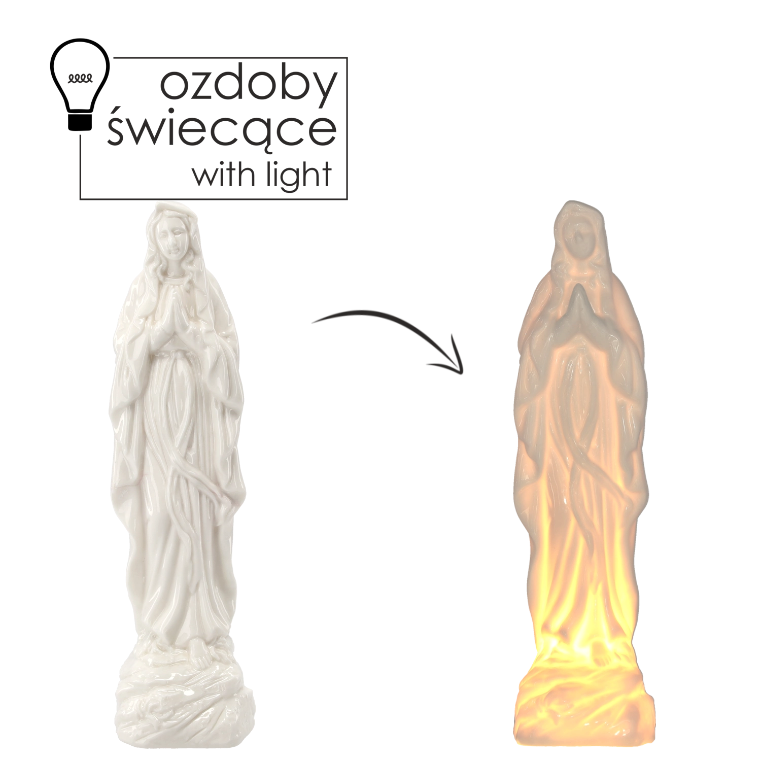 Élégante figurine en porcelaine de la Vierge Marie d’une hauteur de 28,8 cm avec éclairage LED intégré, créant une atmosphère chaleureuse et apaisante dans votre intérieur. Grâce à son alimentation par batterie, elle se place partout sans câbles, idéale pour les décorations de Noël comme pour un recueillement quotidien.