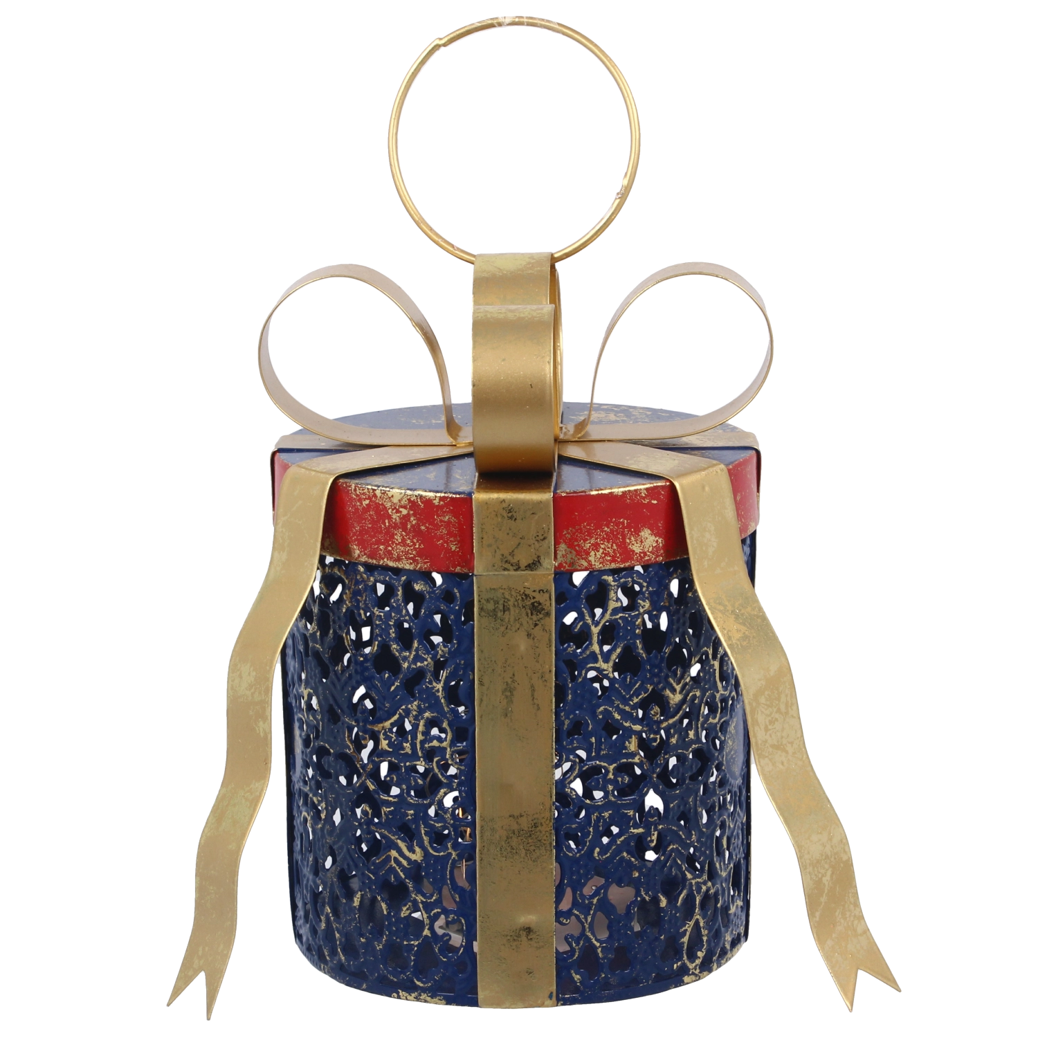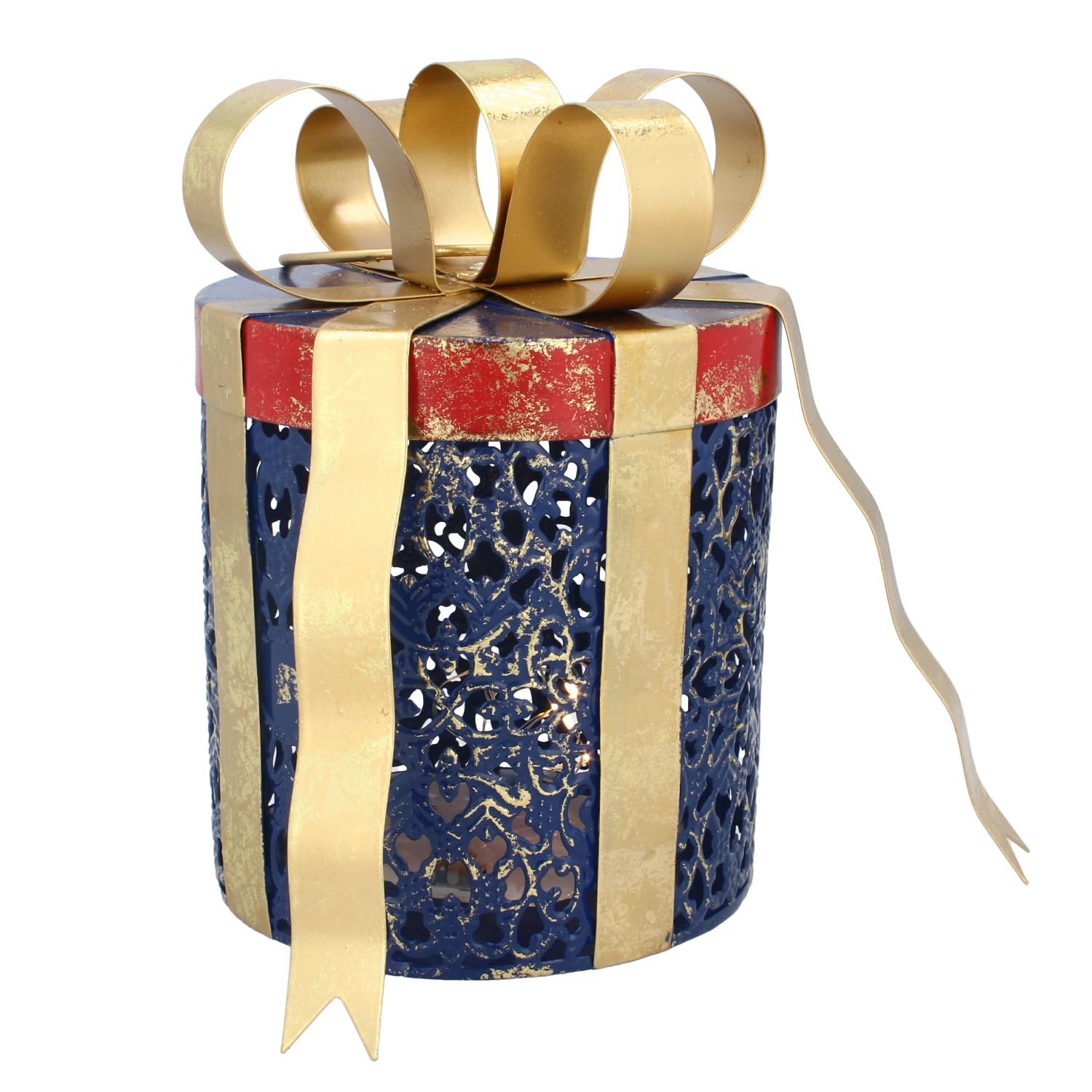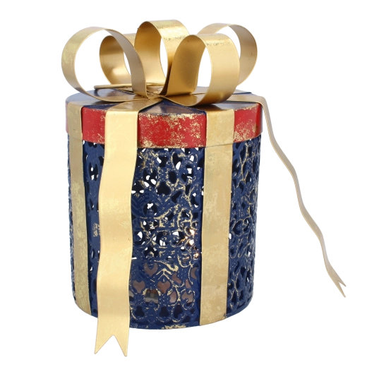 Décoration de Noël en métal en forme de cadeau avec éclairage LED, bleu avec nœud doré