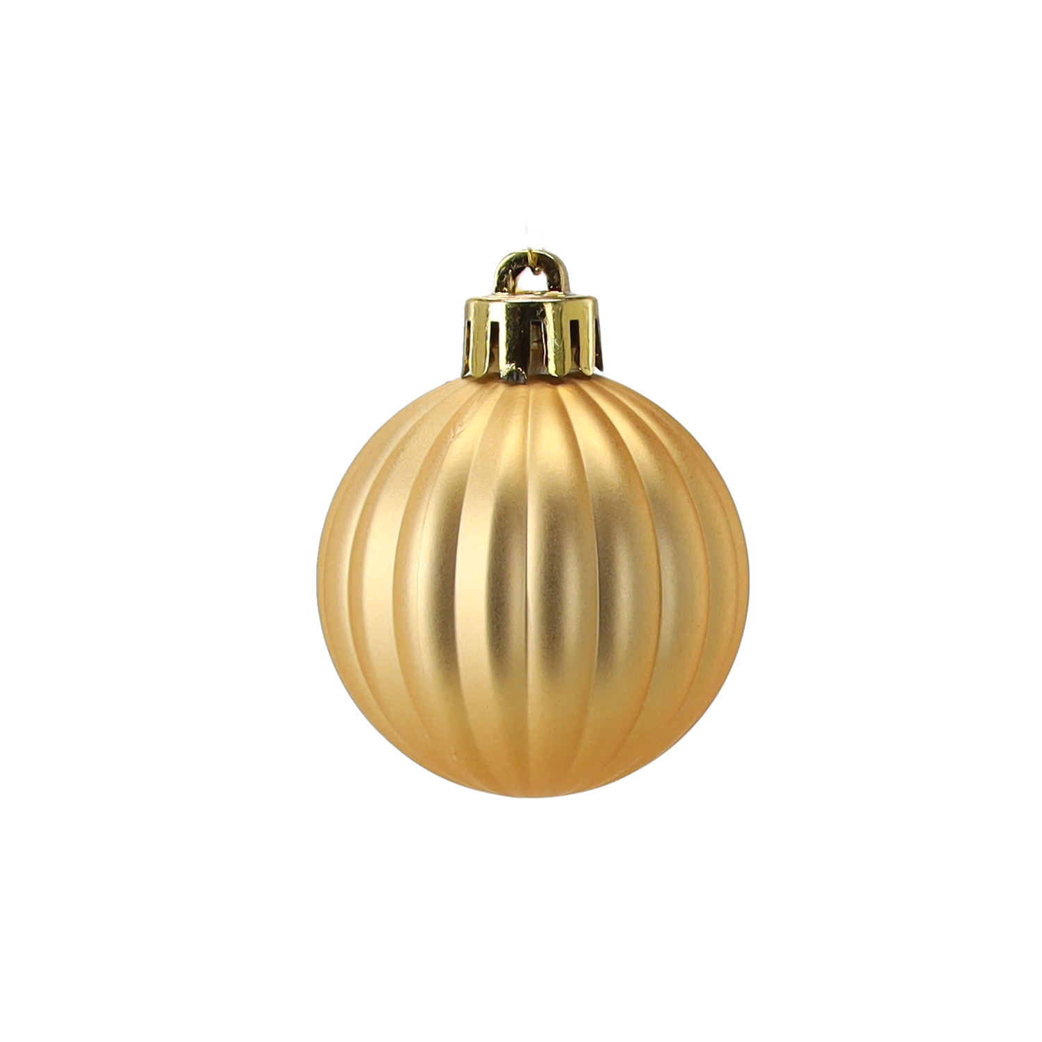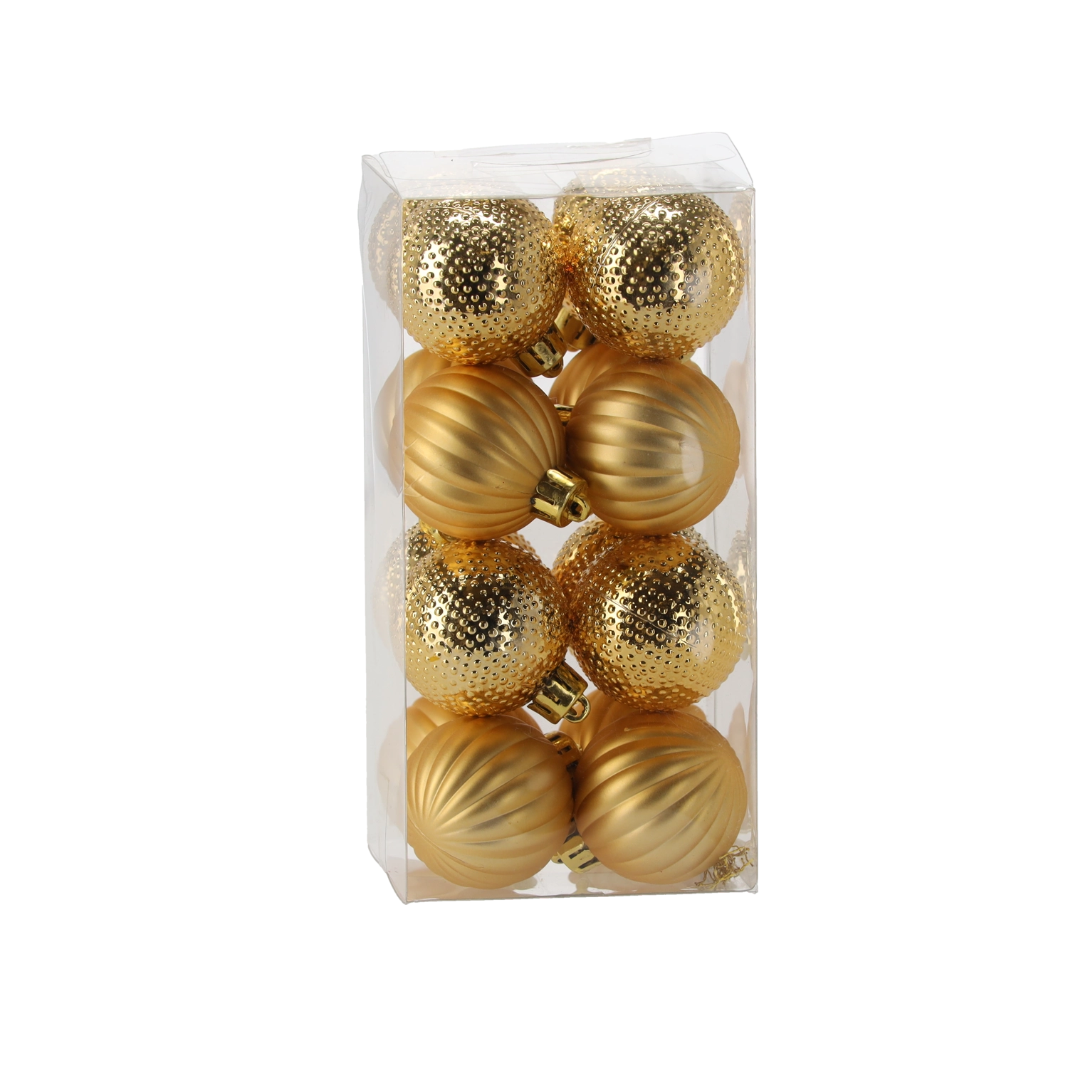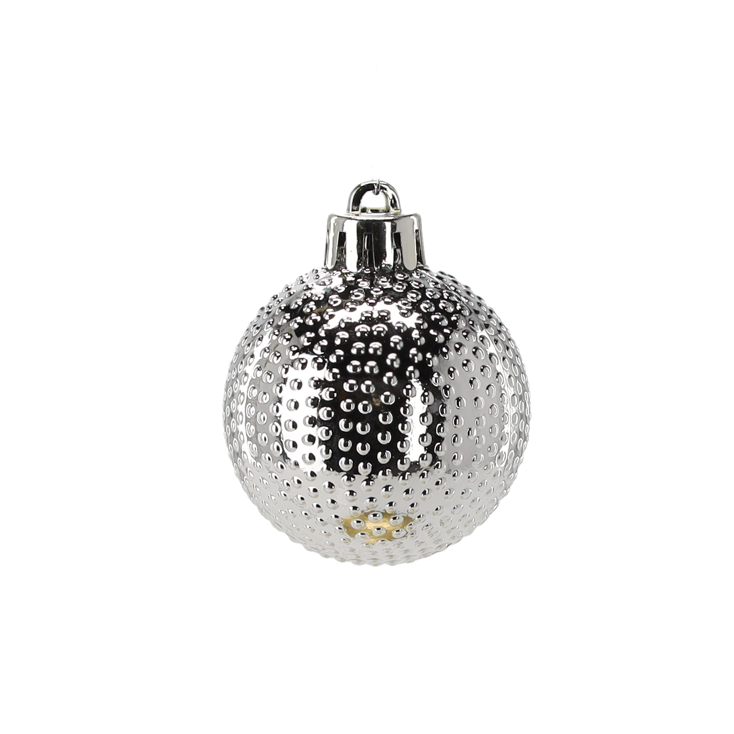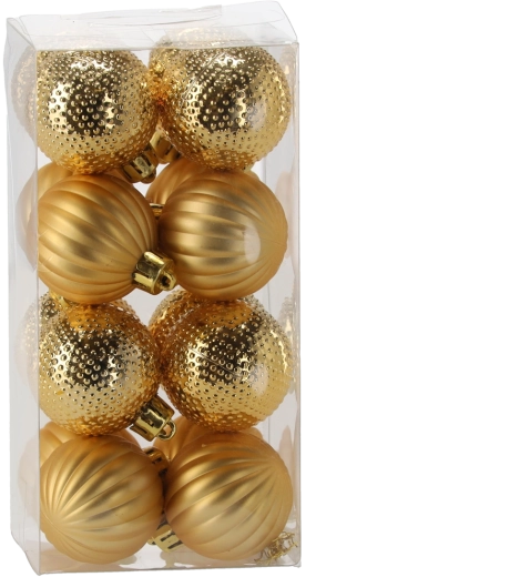Élégant set de 16 boules de Noël de 4 cm de diamètre, dans une combinaison de couleurs rouge, doré et argenté. Différents finitions brillantes et mates avec des motifs en relief apportent à l’arbre profondeur, éclat et atmosphère festive. Fabriquées en plastique résistant pour une utilisation sûre et durable.