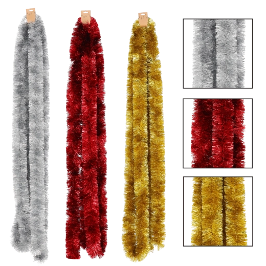 Guirlande de Noël universelle de 6 mètres, idéale pour décorer le sapin, les rampes d’escalier, les fenêtres et d’autres parties de l’intérieur. Grâce à sa conception en plastique léger, elle est facile à manier et n’alourdit pas les branches, tandis que la combinaison de couleurs rouge, or et argent souligne un style traditionnel des fêtes.